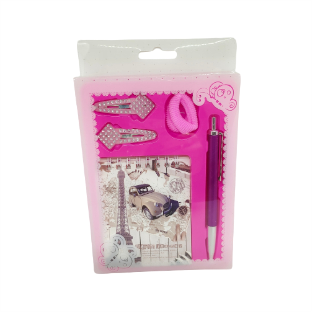 Το σετ περιλαμβάνει μπλοκάκι σημειώσεων, στυλό, 2 τσιμπιδάκια για τα μαλλιά και 2 λαστιχάκια.