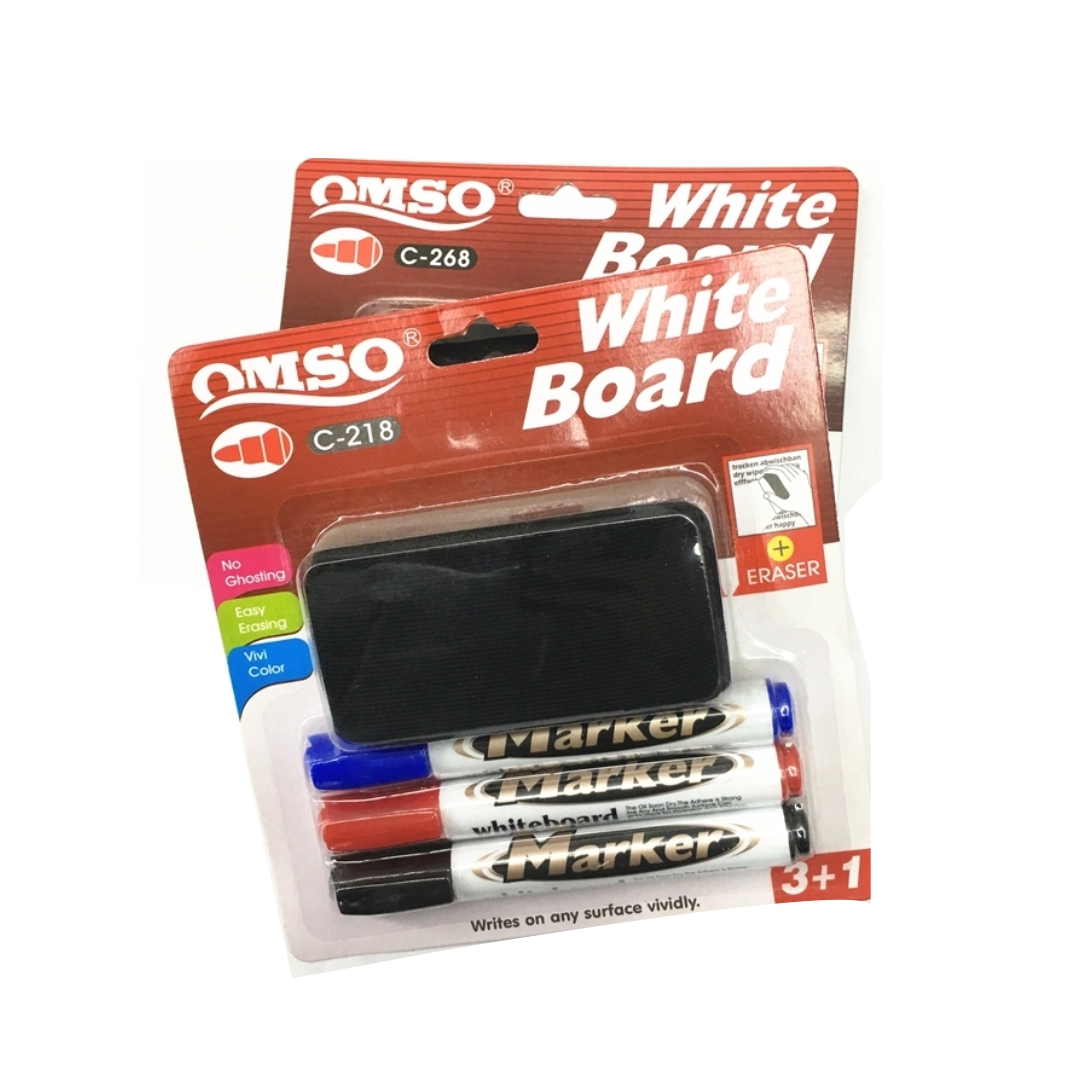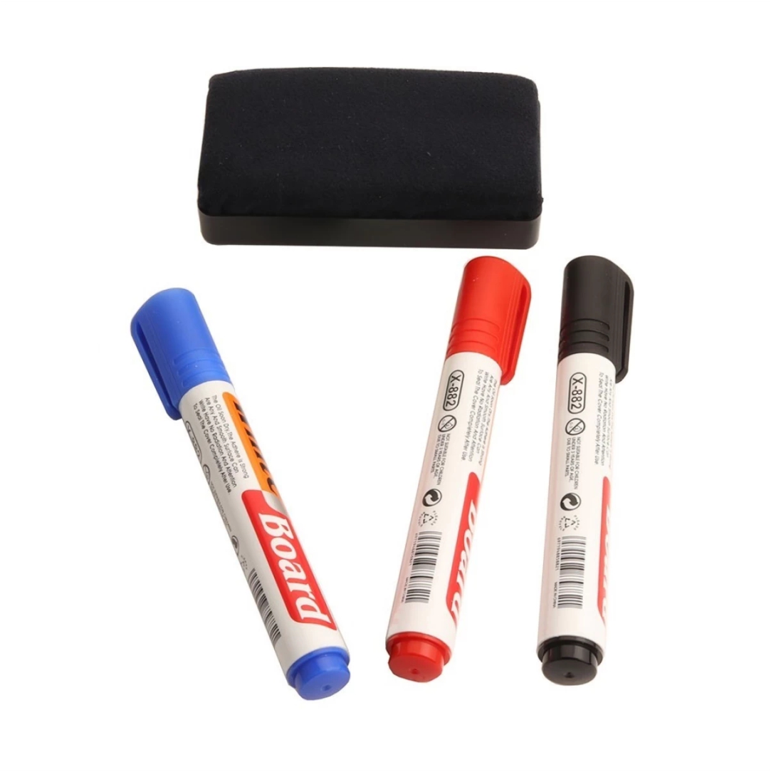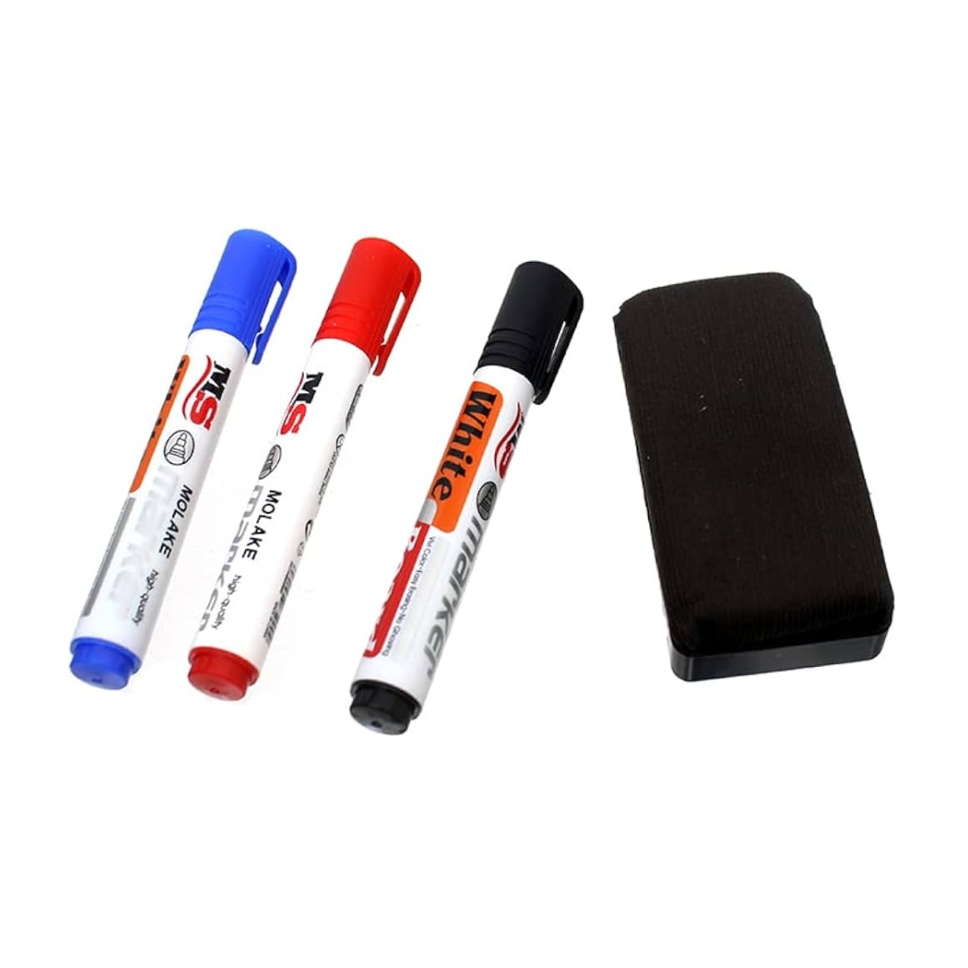 Μαρκαδόροι για ασπροπίνακα. Σβήνει εύκολα χωρίς να αφήνει υπολείμματα. Σταθερή ροή μελανιού και έντονη γραφή. Σετ 4 τεμαχίων κόκκινο, μπλε, μαύρο και σφουγγάρι καθαρισμού.