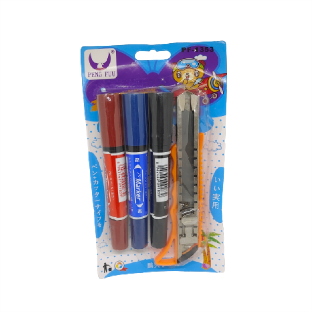 Σετ μαρκαδόροι. Ιδανικό σετ για να υπογραμμίζετε όταν μελετάτε, να σημειώσετε και γράφετε χωρίς να να φοβάστε ότι θα ξεβάψει . Σετ 4 τεμαχίων κόκκινο, μαύρο, μπλε μαρκαδόροι και χαρτοκόπτης. Διαθέτει μαρκαδόρο και από τις δύο πλευρές.