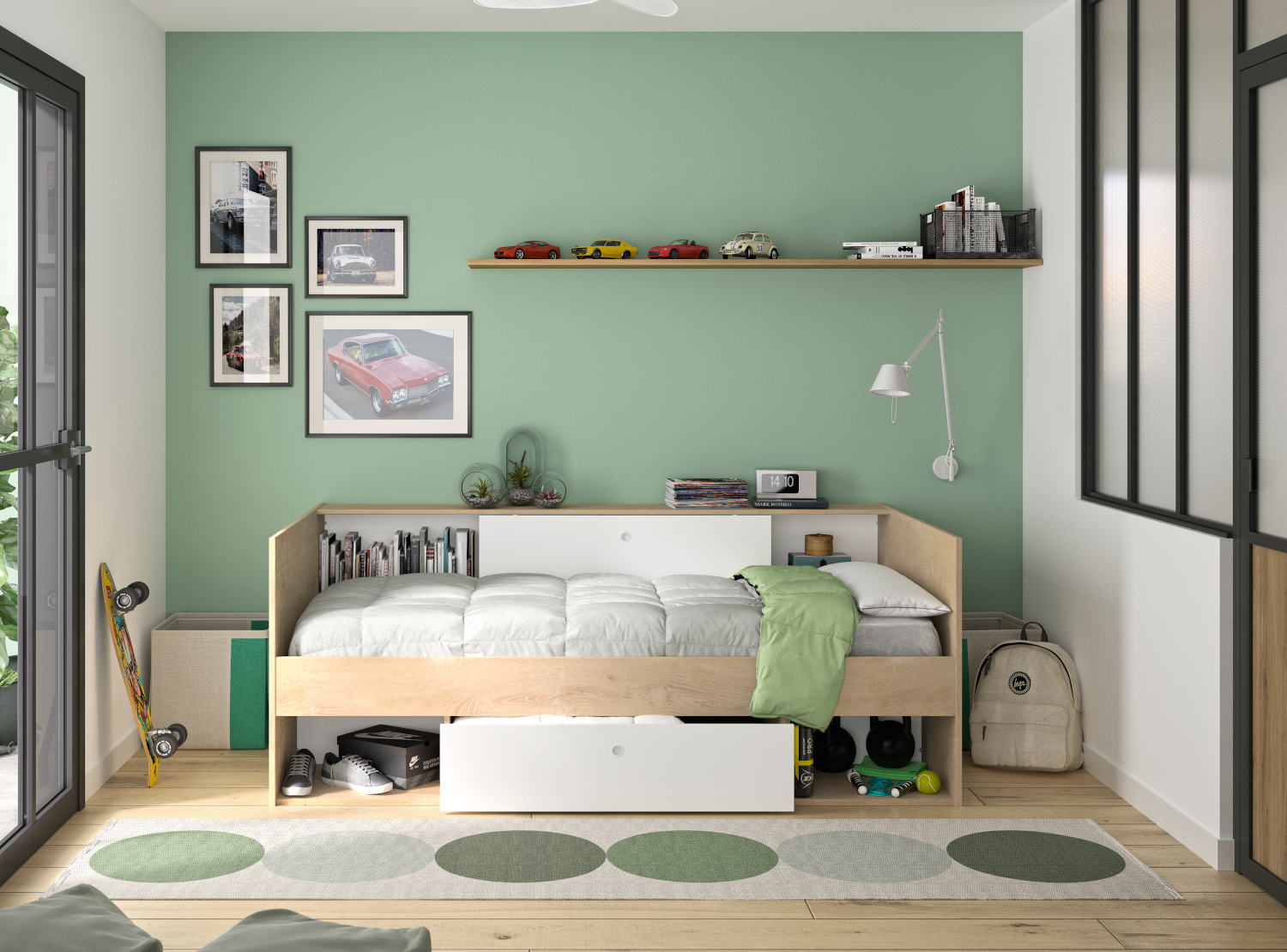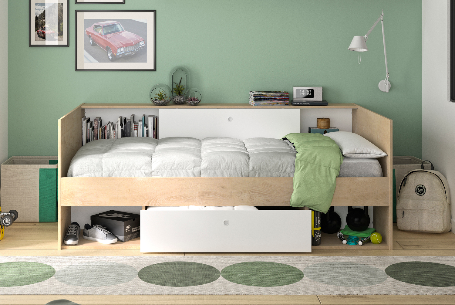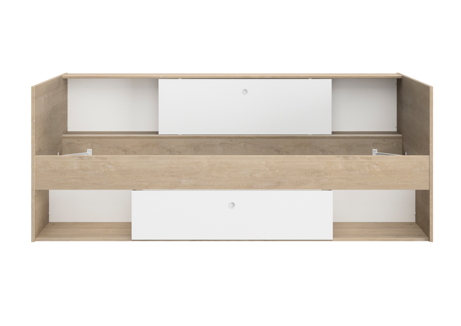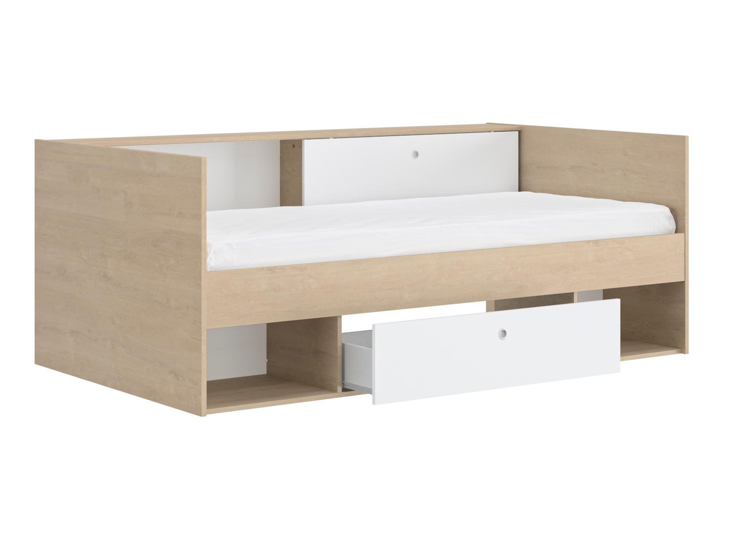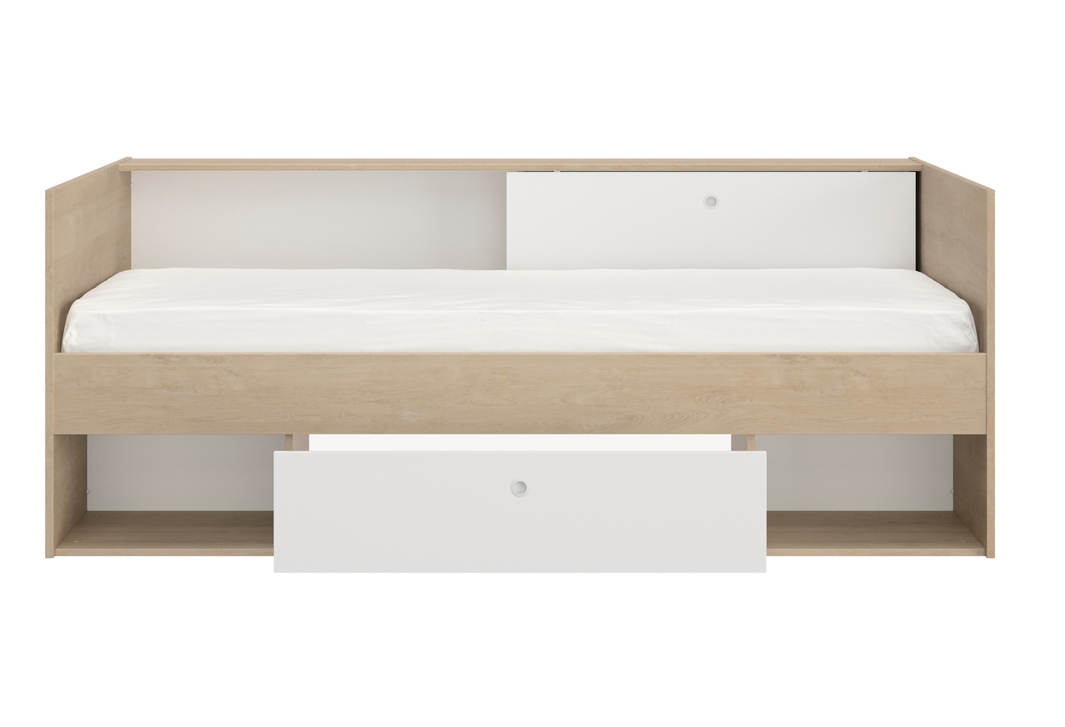 Το μονό κρεβάτι Alicia με το όμορφο και απλό σχέδιο του θα σας ενθουσιάσει. Οι διαστάσεις του είναι 116×204εκ. ( ύψος 79εκ. ) και το χρώμα του ένας υπέροχος συνδυασμός λευκού με natural chestnut. Διαθέτει ένα συρτάρι, δύο ανοιχτούς χώρους αποθήκευσης κάτω και δύο χώρους αποθήκευσης στο πανω μερος με μια συρόμενη πόρτα. Το κρεβάτι Alicia είναι γαλλικής κατασκευής.