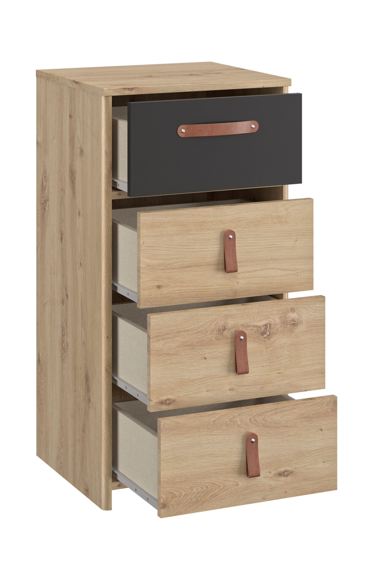 Η ψηλή συρταριέρα Arthus με την υπέροχη διχρωμία της – artisan oak και μαύρου – θα ομορφύνει το υπνοδωμάτιό σας. Διαθέτει τέσσερα συρτάρια με δερμάτινα χερούλια .Οι διαστάσεις της είναι 44x41x87εκ. Συνδυάστε τη με τα υπόλοιπα έπιπλα της σειράς Arthus. Η συρταριέρα είναι γαλλικής κατασκευής.