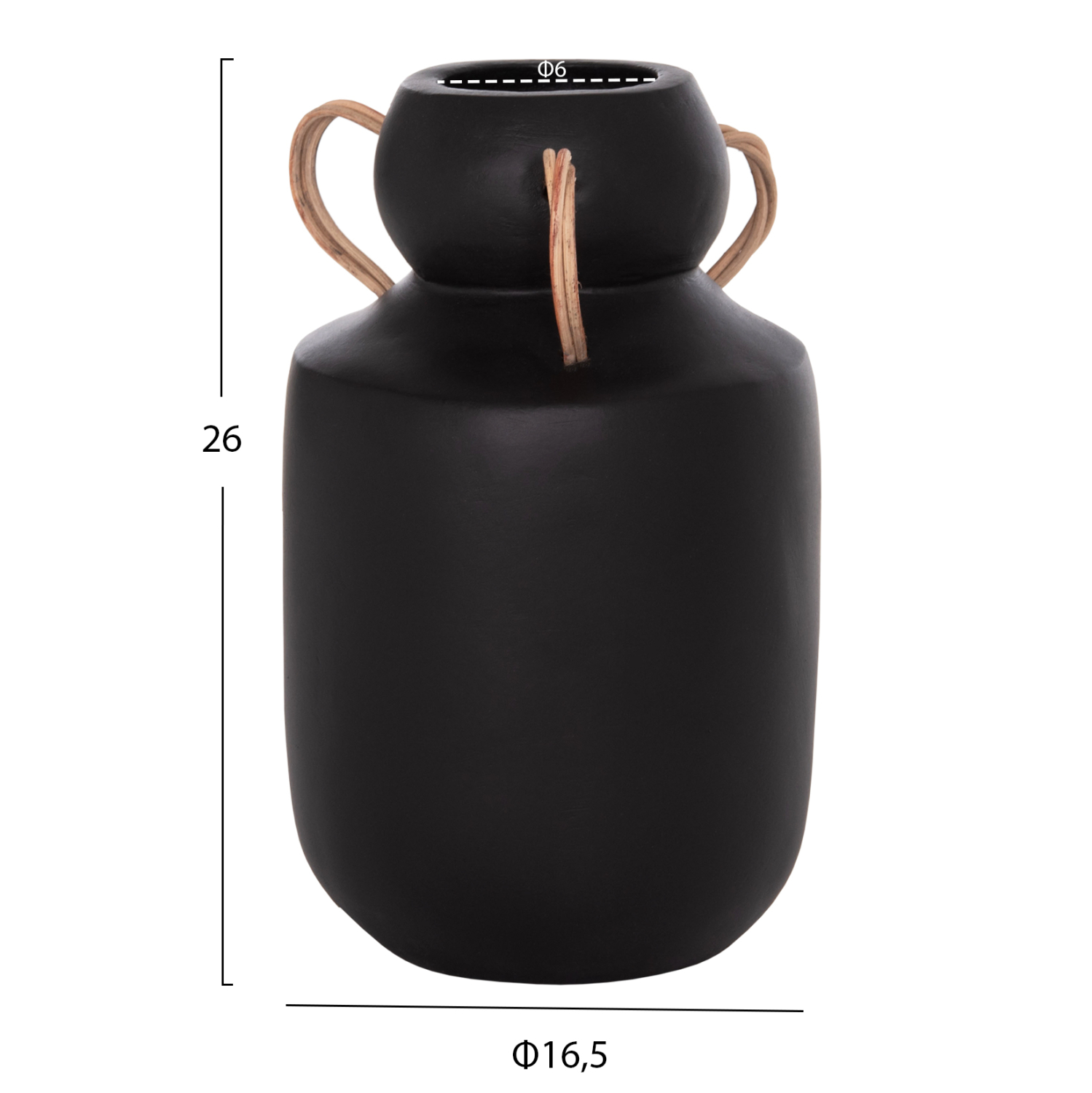 Το διακοσμητικό βάζο MIBO έχει κλασικό σχήμα ενώ διαθέτει χερούλια στο επάνω μέρος από φυσικό rattan. Είναι σε ΜΑΥΡΗ απόχρωση και μπορεί να ταιριάξει οπουδήποτε το θελήσετε. Είτε στο σπίτι είτε σε επαγγελματικούς χώρους.
