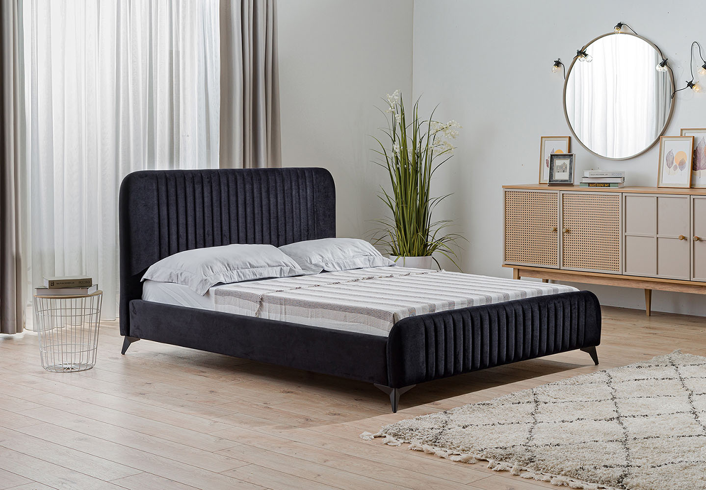 Το διπλό κρεβάτι Karina είναι κατασκευασμένο από υψηλής ποιότητας ύφασμα και μπορεί να προσαρμοστεί σε διαφορετικές διαστάσεις και χρώμα. Συμπεριλαμβάνει στη τιμή το τελάρο. Στη τιμή δεν συμπεριλαμβάνεται το στρώμα.