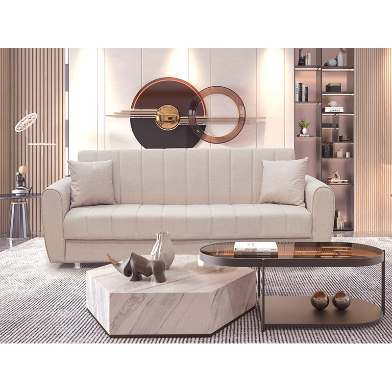 Elva τριθέσιος καναπές/κρεβάτι με ύφασμα με ιδιαίτερο σχεδιασμό με ρίγα σε χρώμα light brown και διακοσμητικά μαξιλάρια για επιπλέον άνεση. Ένας διαχρονικός καναπές που συνδυάζει ομορφιά και εργονομία εφόσον μετατρέπεται άμεσα σε κρεβάτι όταν παρουσιαστεί ανάγκη για ένα επιπλέον κρεβάτι. Ο εσωτερικός αποθηκευτικός χώρος που διαθέτει κάτω από το κάθισμα προσφέρεται για πράγματα ή κλινοσκεπάσματα που θέλετε να έχετε γρήγορη πρόσβαση, αλλά να μην είναι σε εμφανές σημείο στο χώρο σας.