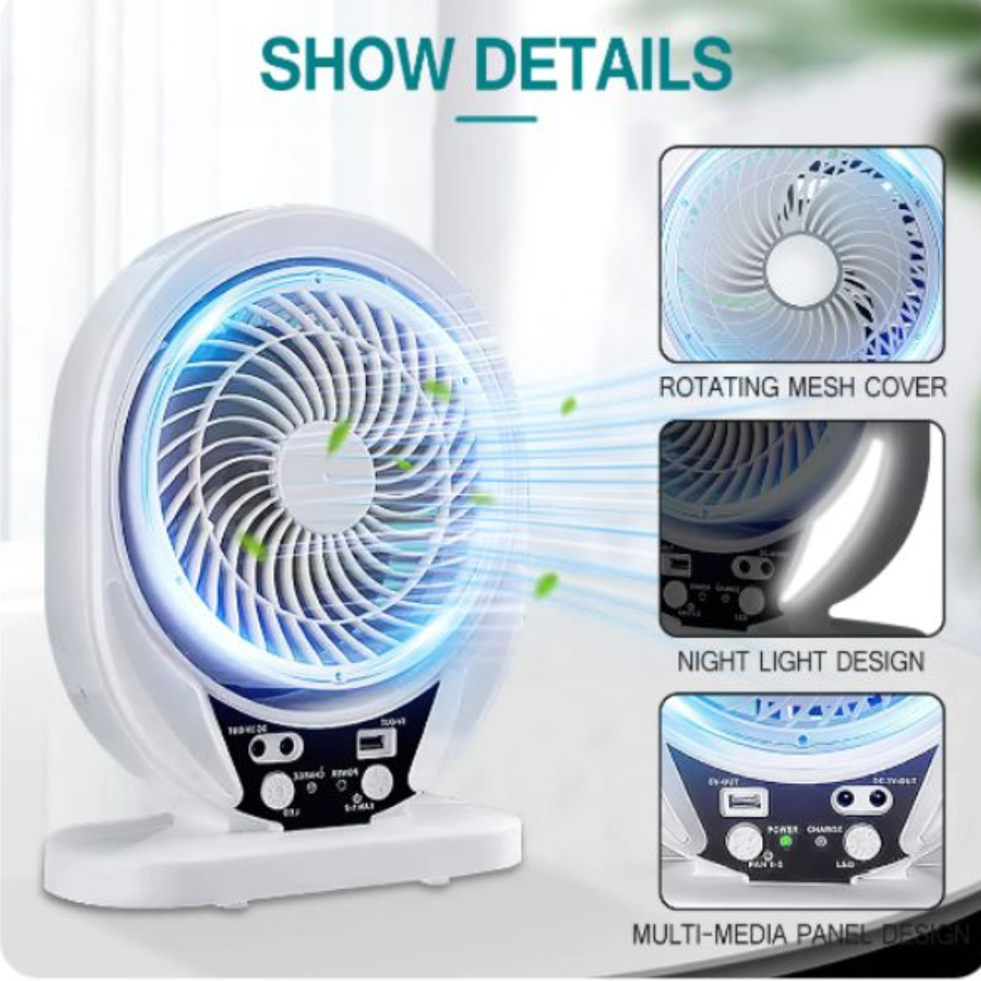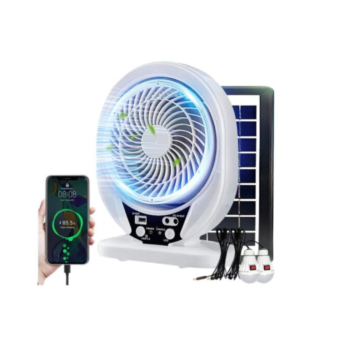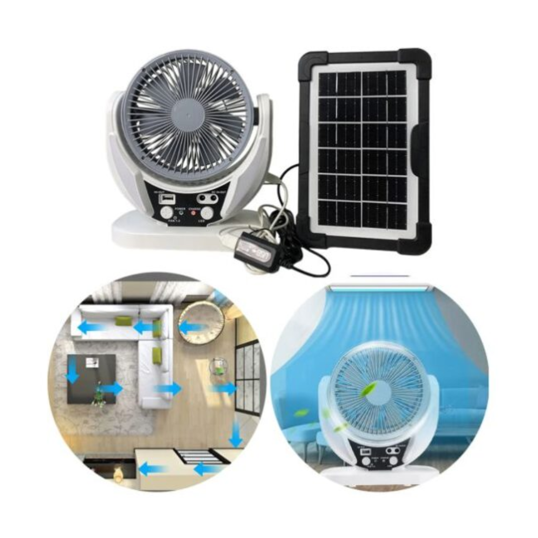 Επαναφορτιζόμενος ανεμιστήρας 6″ με λάμπες LED και ξεχωριστό ηλιακό πάνελ. Ενσωματώνει μια μπαταρία υψηλής χωρητικότητας, η οποία αποθηκεύει την ηλιακή ενέργεια για εκτεταμένη λειτουργία του ανεμιστήρα, ακόμη και όταν το φως του ήλιου δεν είναι διαθέσιμο. Mε 2 λαμπτήρες LED, παρέχοντας λειτουργικότητα φωτισμού για μεγαλύτερη άνεση σε εξωτερικούς χώρους. Κατασκευασμένο για να αντέχει σε εξωτερικές συνθήκες, εξασφαλίζοντας ανθεκτικότητα και αξιοπιστία ακόμη και σε διαφορετικά καιρικά περιβάλλοντα. Προσφέρει λειτουργίες ψύξης και φωτισμού, παρέχοντας λειτουργικότητα διπλής χρήσης για βελτιωμένη πρακτικότητα. Ο λαμπτήρας LED χρησιμεύει ως βολική εφεδρική πηγή φωτισμού, εξασφαλίζοντας ορατότητα κατά τη διάρκεια νυχτερινών δραστηριοτήτων ή έκτακτων περιστατικών.