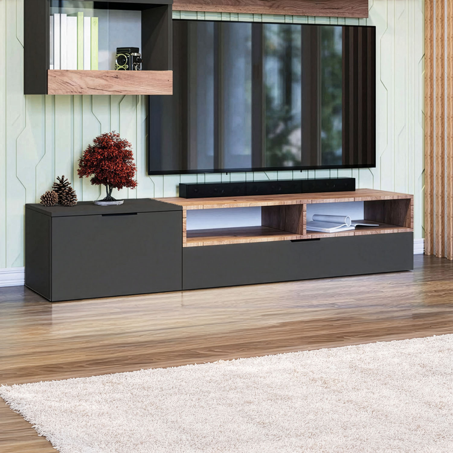 Έπιπλο Τηλεόρασης Morocco, Ευρωπαϊκης Κατασκευής, εξαιρετικής ποιότητας και υψηλής αντοχής, με ιδιαίτερο συνδυασμό χρωμάτων, ανθρακί με χρυρό δρυς.