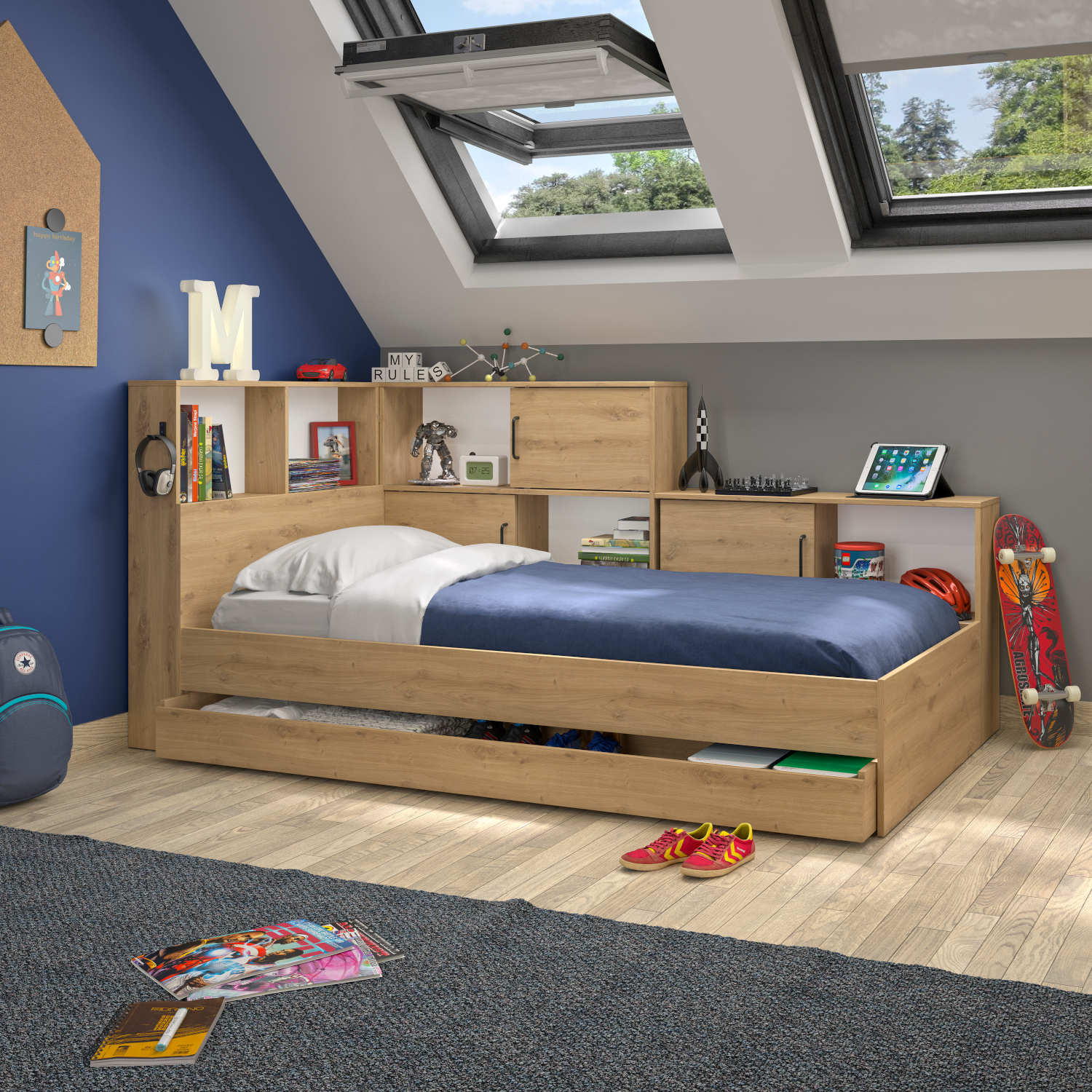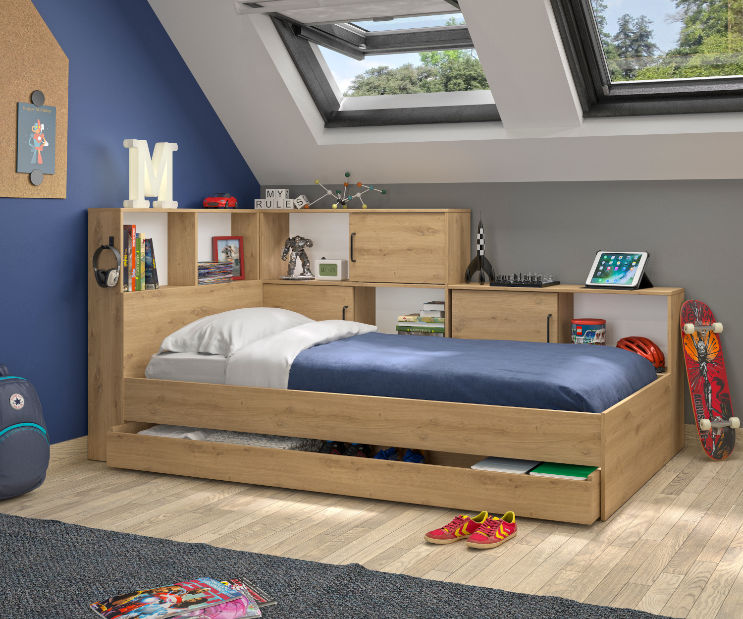 Το κρεβάτι Erwan είναι ιδανικό για εσάς που θέλετε πολλούς αποθηκευτικούς χώρους. Διαθέτει ένα μεγάλο συρτάρι αποθήκευσης κάτω από το κρεβάτι και μεγάλα ράφια αποθήκευσης σε δυο πλευρές του κρεβατιού – κάποια με συρόμενες πόρτες.  Διαθέτει επίσης γάντζο για να κρεμάτε ακουστικά ήχου ή οτιδήποτε θέλετε.  Το χρώμα του κρεβατιού Erwan είναι artisan oak και οι διαστάσεις του 120×221εκ. ( ύψος 104εκ. ) Κατά τη συναρμολόγηση επιλέγετε από ποια μεριά θέλετε να είναι οι αποθηκευτικοί χώροι.  Το κρεβάτι είναι γαλλικής κατασκευής.