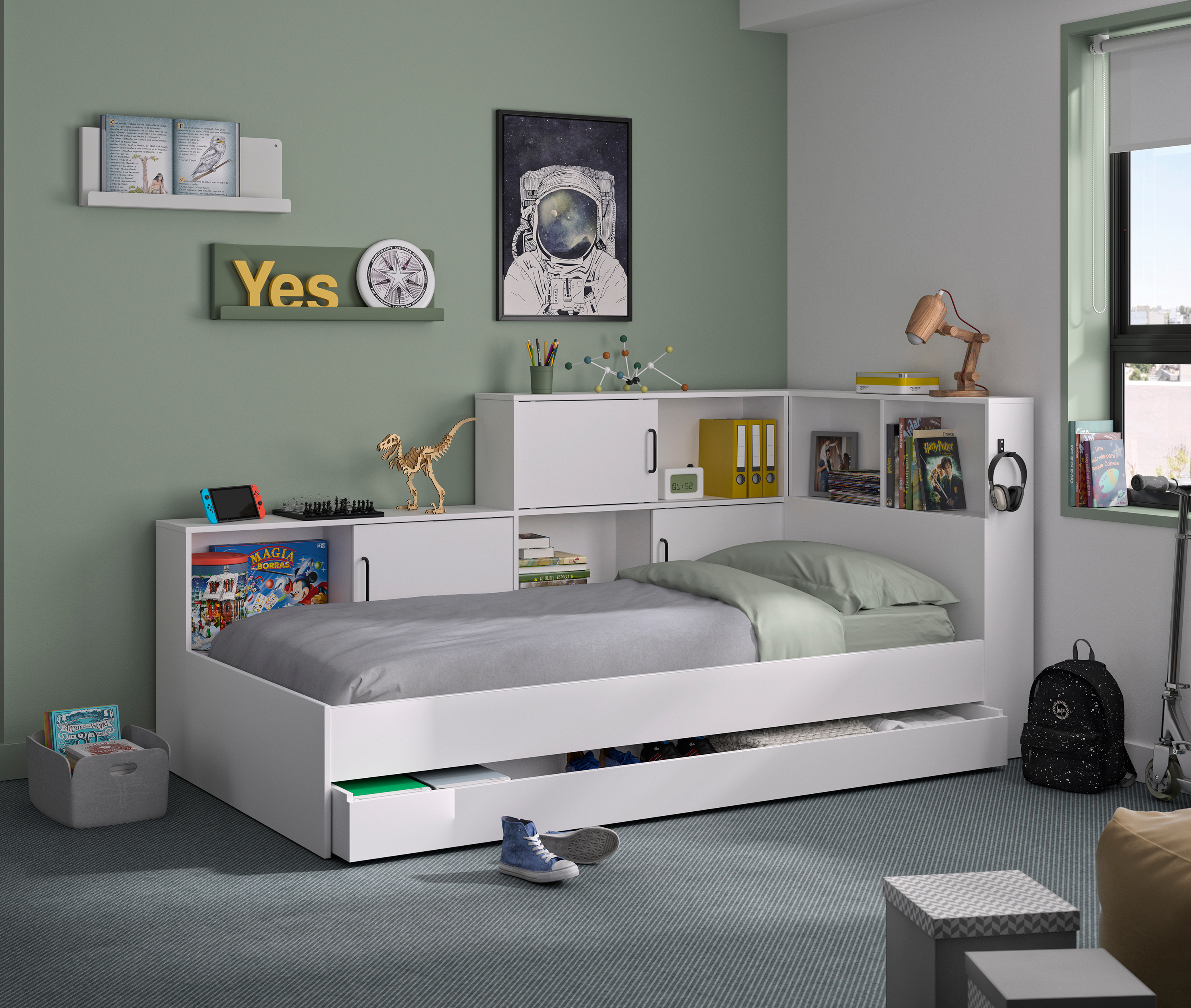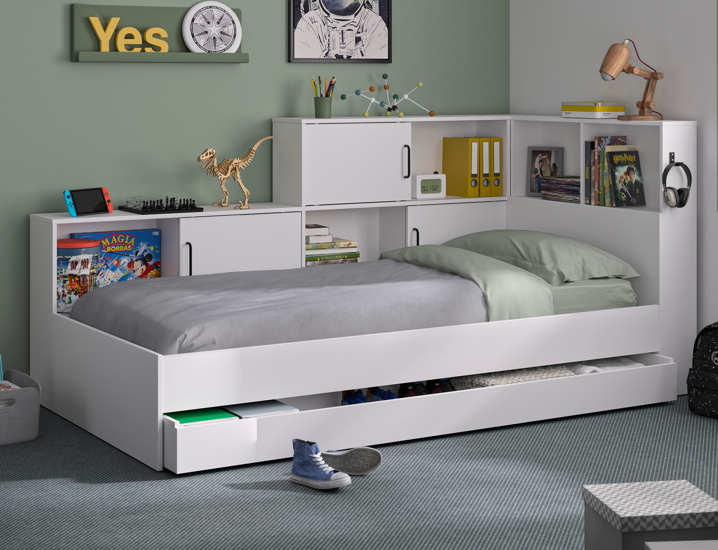 Το κρεβάτι Erwan είναι ιδανικό για εσάς που θέλετε πολλούς αποθηκευτικούς χώρους. Διαθέτει ένα μεγάλο συρτάρι αποθήκευσης κάτω από το κρεβάτι και μεγάλα ράφια αποθήκευσης σε δυο πλευρές του κρεβατιού – κάποια με συρόμενες πόρτες. Διαθέτει επίσης γάντζο για να κρεμάτε ακουστικά ήχου ή οτιδήποτε θέλετε. Το χρώμα του κρεβατιού Erwan είναι λευκό και οι διαστάσεις του 120×221εκ. ( ύψος 104εκ. ) Κατά τη συναρμολόγηση επιλέγετε από ποια μεριά θέλετε να είναι οι αποθηκευτικοί χώροι. Το κρεβάτι είναι γαλλικής κατασκευής.