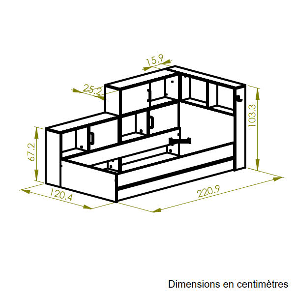 Το κρεβάτι Erwan είναι ιδανικό για εσάς που θέλετε πολλούς αποθηκευτικούς χώρους. Διαθέτει ένα μεγάλο συρτάρι αποθήκευσης κάτω από το κρεβάτι και μεγάλα ράφια αποθήκευσης σε δυο πλευρές του κρεβατιού – κάποια με συρόμενες πόρτες. Διαθέτει επίσης γάντζο για να κρεμάτε ακουστικά ήχου ή οτιδήποτε θέλετε. Το χρώμα του κρεβατιού Erwan είναι ένας υπέροχος συνδυασμός λευκού με natural chestnut και οι διαστάσεις του 120×221εκ. ( ύψος 104εκ. ) Κατά τη συναρμολόγηση επιλέγετε από ποια μεριά θέλετε να είναι οι αποθηκευτικοί χώροι. Το κρεβάτι είναι γαλλικής κατασκευής.