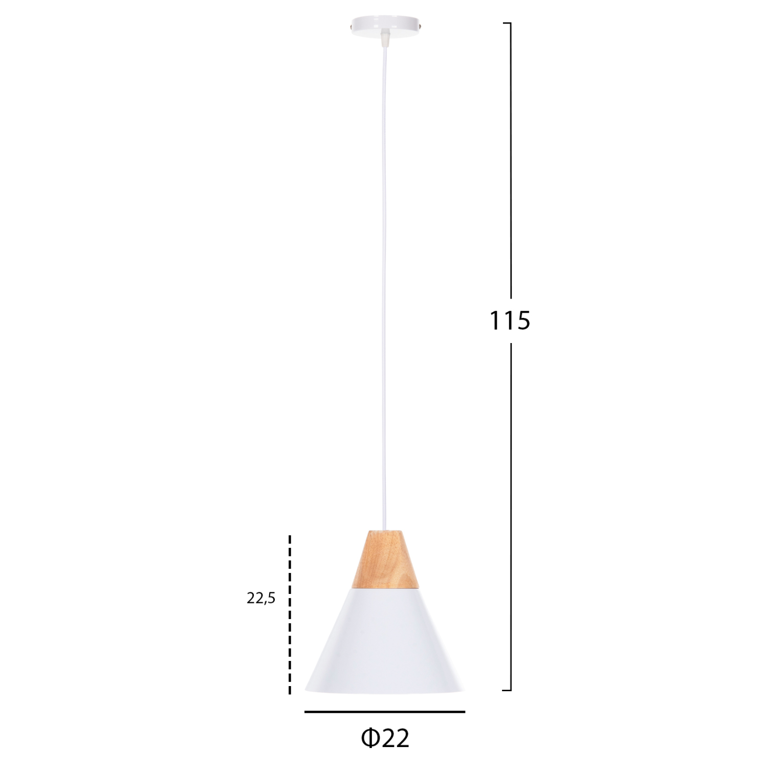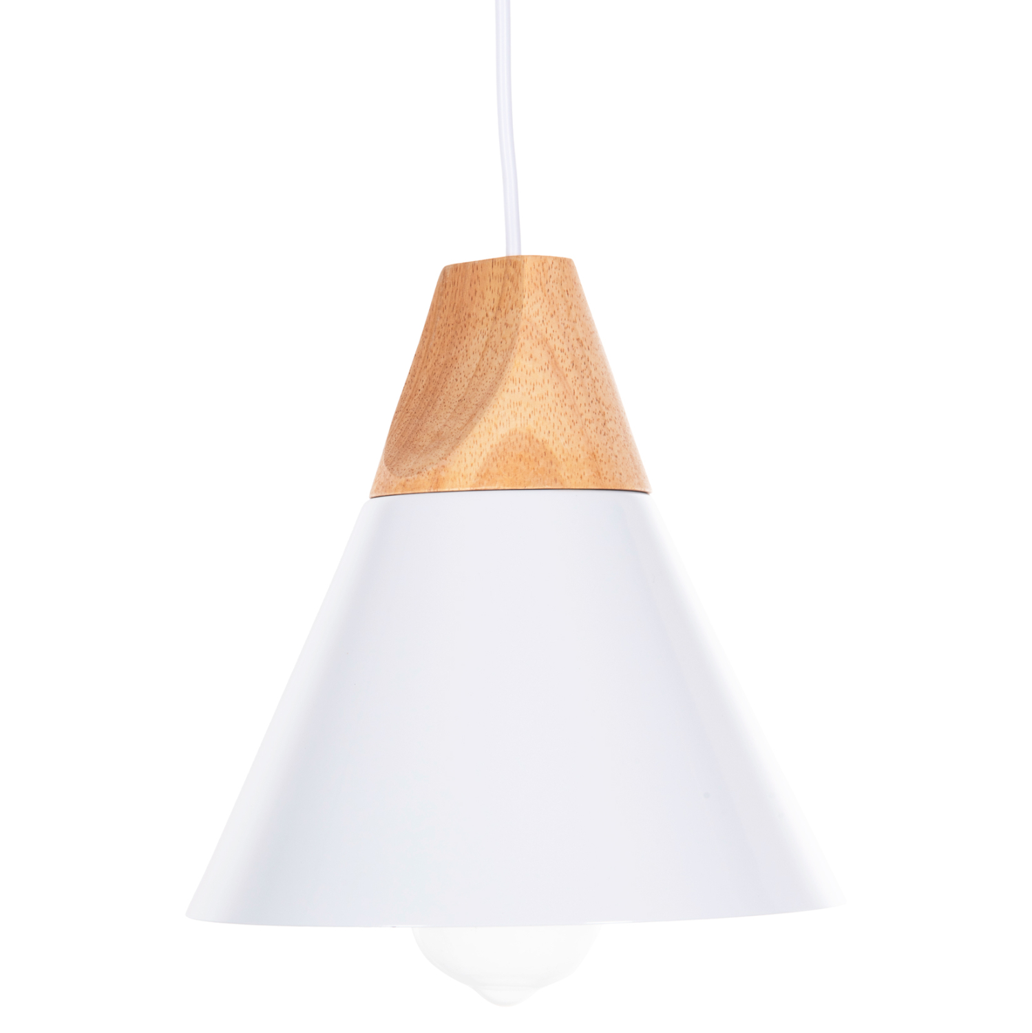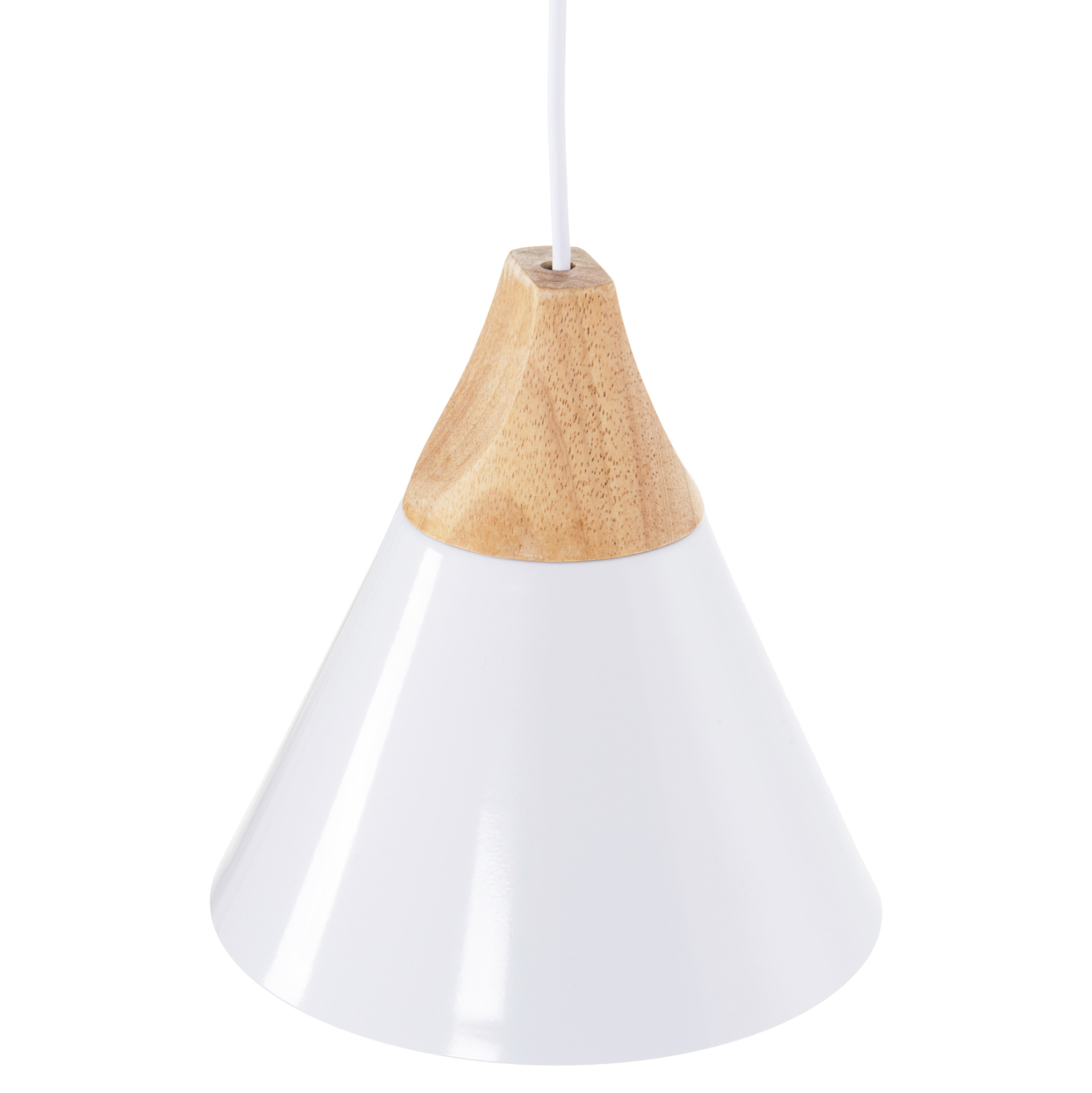 Ανακαλύψτε αυτό το νέο μας κρεμαστό φωτιστικό οροφής και ολοκληρώστε την διακόσμησή σας. Πρόκειται για ένα φωτιστικό με ΛΕΥΚΟ μεταλλικό καπέλο σε σχήμα κωνικής καμπάνας με λεπτομέρεια ξύλου στην κορυφή του φωτιστικού. Αισθητικά, ολοκληρώνεται με το επίσης ΛΕΥΚΟ καλώδιο κρέμασης και την λευκή βάση οροφής, και αποτελεί την τελευταία τάση στα φωτιστικά οροφής.