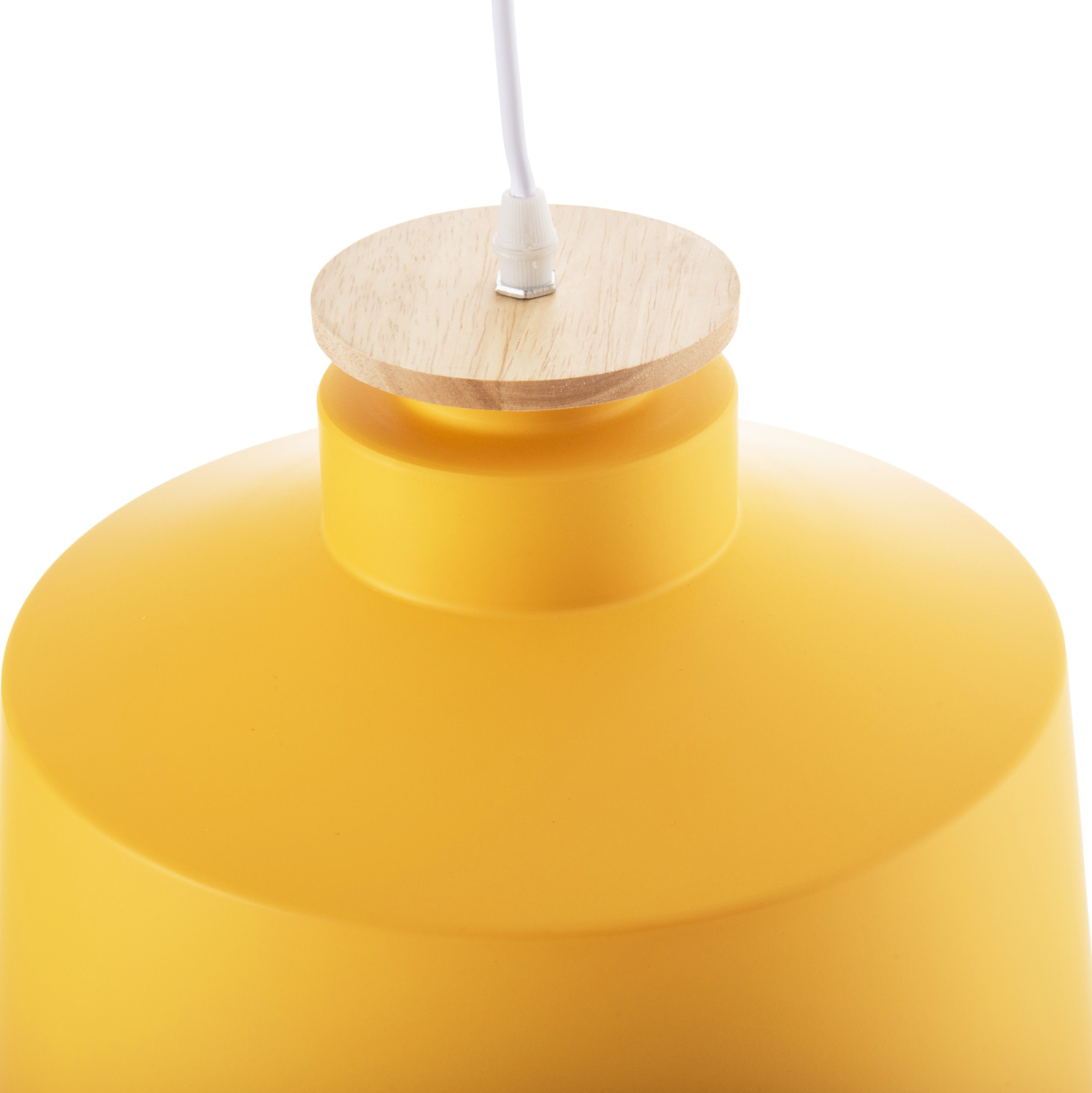 Ανακαλύψτε αυτό το νέο μας κρεμαστό φωτιστικό οροφής και ολοκληρώστε την διακόσμησή σας. Πρόκειται για ένα φωτιστικό με ΚΙΤΡΙΝΟ καπέλο αλουμινίου σε σχήμα καμπάνας με λεπτομέρεια ξύλου στην κορυφή του φωτιστικού. Αισθητικά, ολοκληρώνεται με το λευκό καλώδιο κρέμασης και την λευκή βάση οροφής, και αποτελεί την τελευταία τάση στα φωτιστικά οροφής.