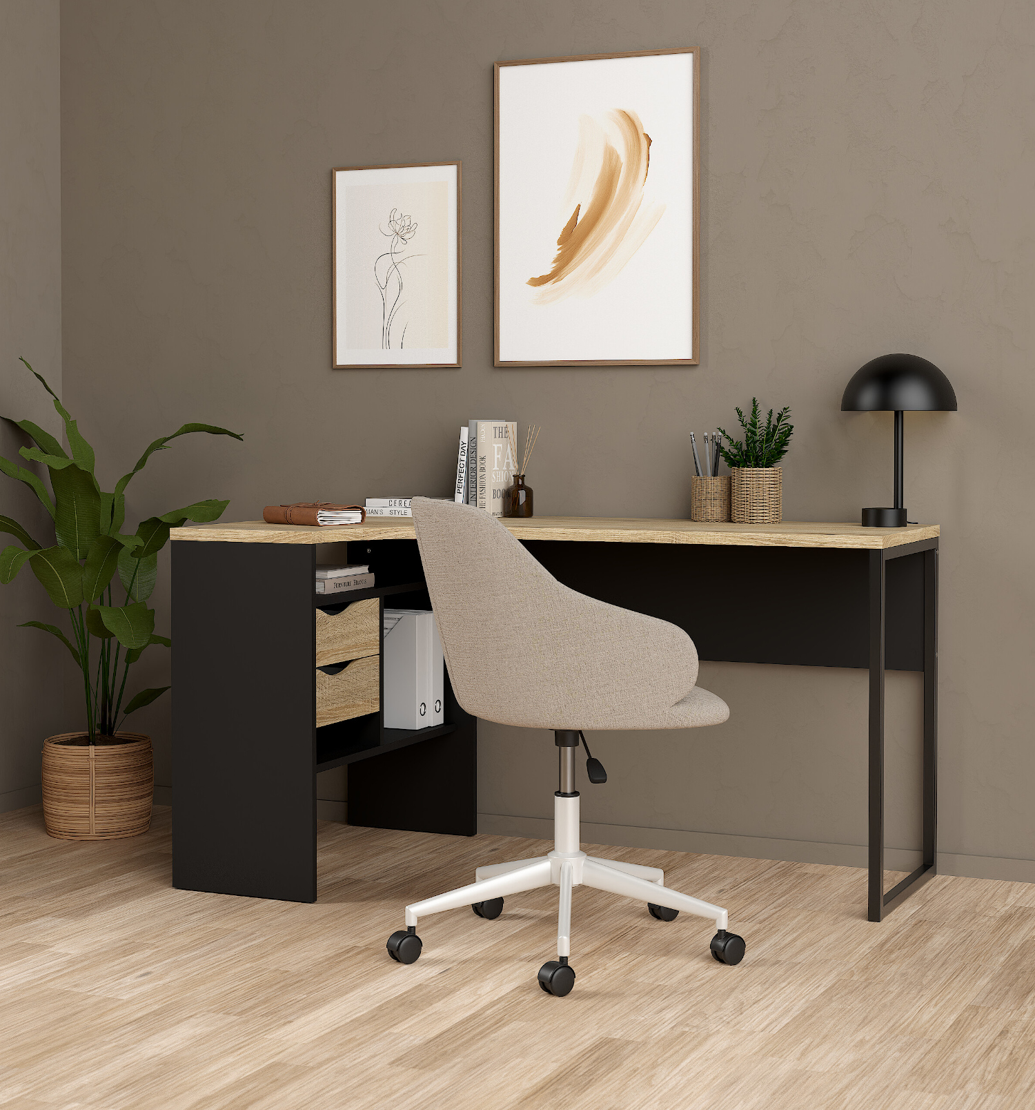 Το γωνιακό γραφείο Function Plus συνδυάζει τη μοντέρνα αισθητική με την πρακτική σχεδίαση. Οι διαστάσεις του είναι 145,1×81εκ. ( 76,8εκ. ) και το χρώμα του είναι ένας υπέροχος συνδυασμός μαύρου με δρυς. Διαθέτει 2 συρτάρια και μεταλλικά πόδια. Το γωνιακό γραφείο Fuction Plus κατασκευάζεται στη Δανία.