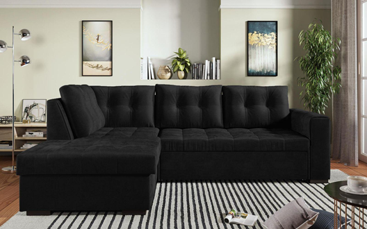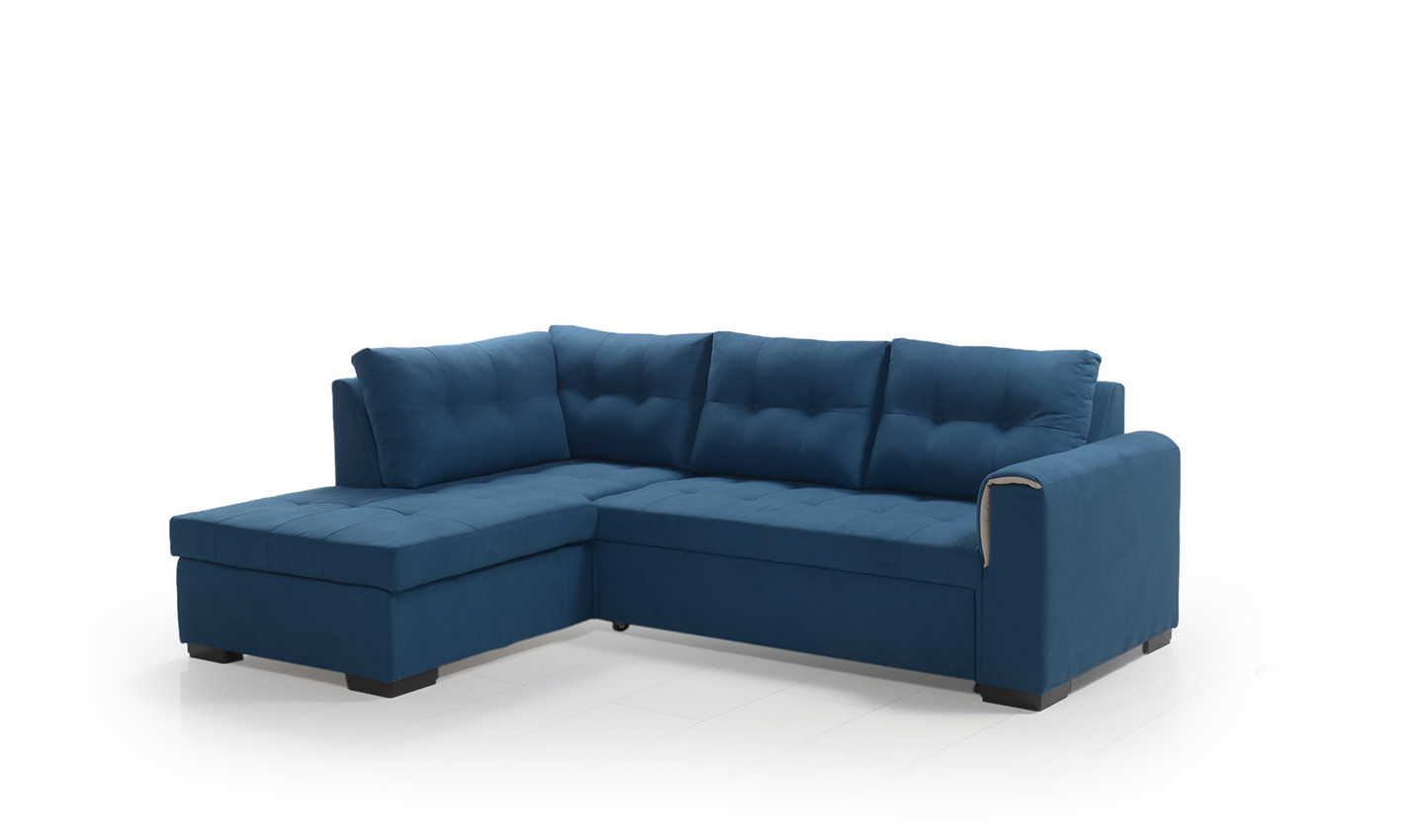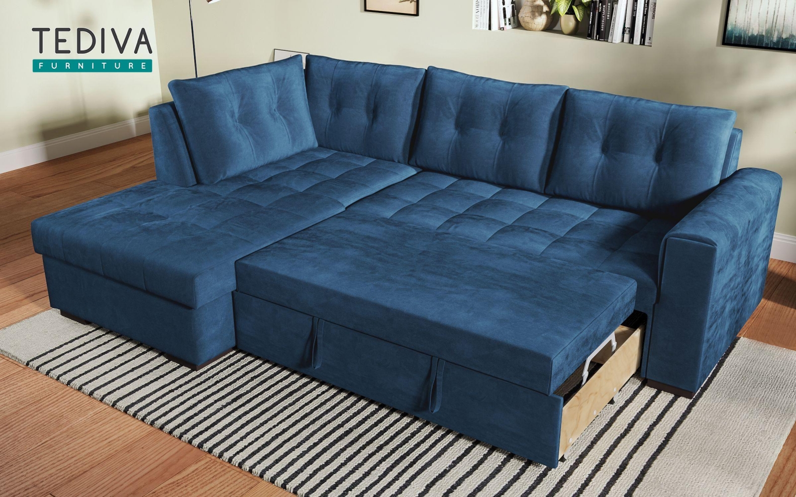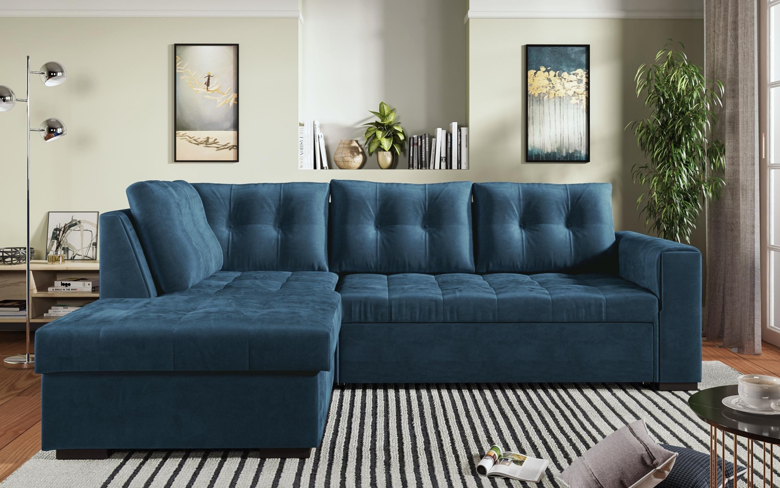Γωνιακός καναπές κρεβάτι Vanty με αποθηκευτικό χώρο, σκούρο μπλε/αριστερή γωνία. Καναπές κρεβάτι με λειτουργία ύπνου και άνετο μεγάλο συρτάρι κάτω από το μέρος χαλάρωσης για περισσότερη άνεση. Άνετος και βαθύς καναπές με χώρο για όλους στην οικογένεια.