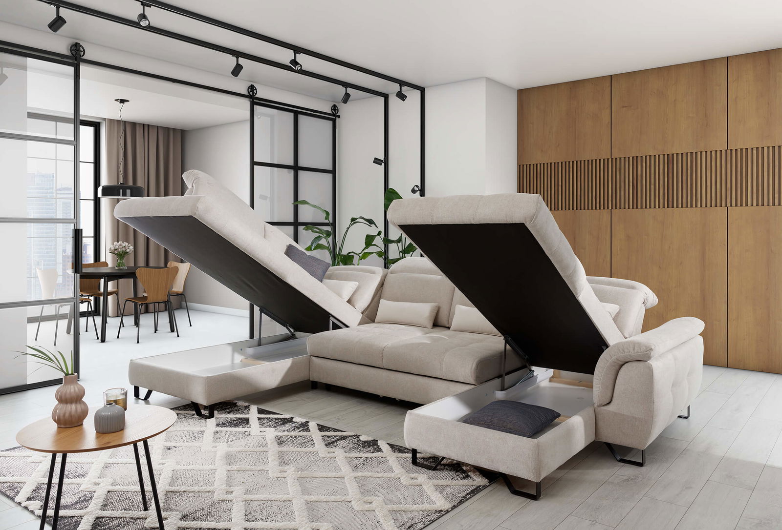 * Επιλέγοντας γωνία διαλέται από ποια πλευρά θα είναι ο μεγαλύτερος αποθηκευτικός χώρος και η μεγαλύτερη γωνία του καναπέ