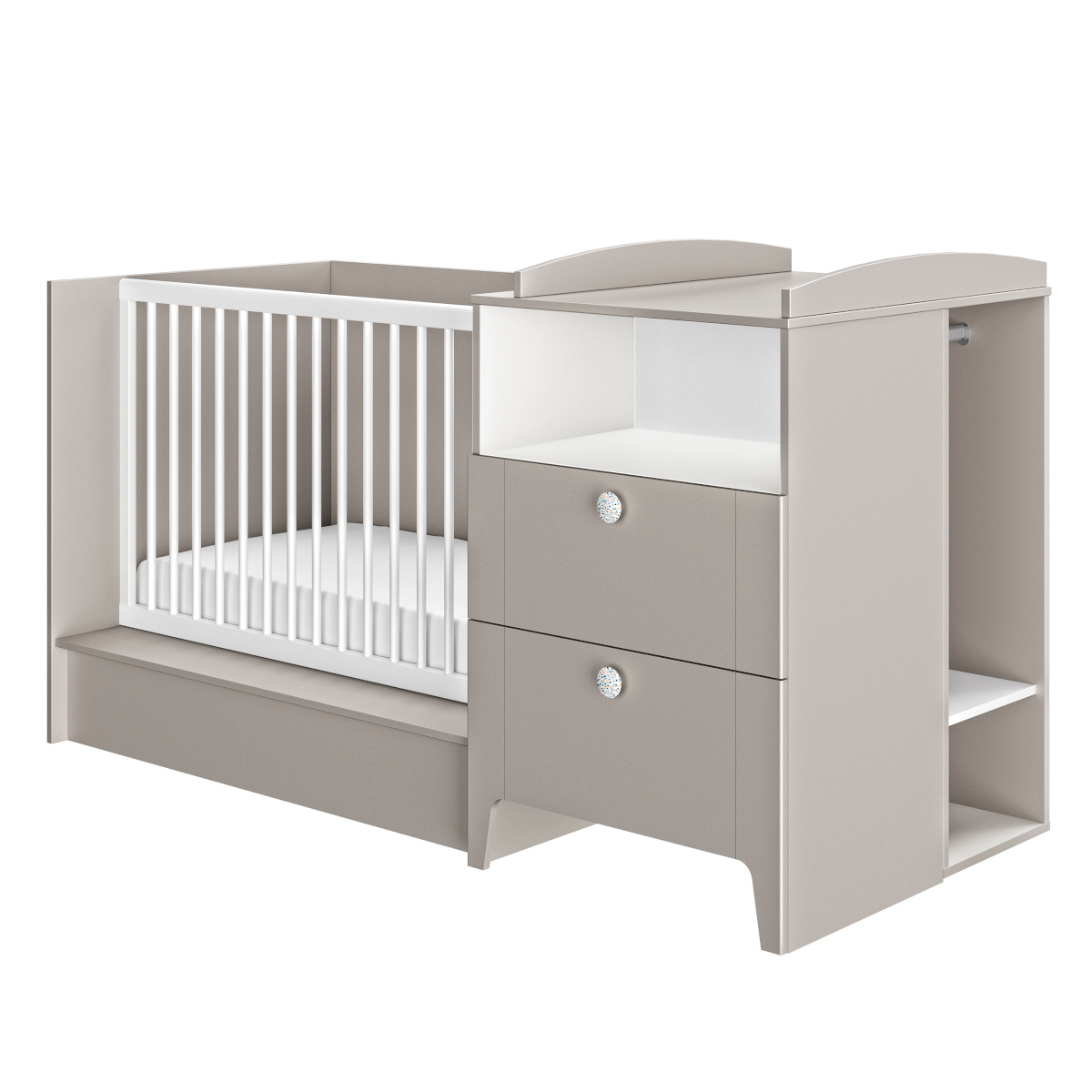 Η αλλαξιέρα είναι πολύ πρακτική με την εσοχή και τα δύο συρτάρια, εξασφαλίζοντας ότι έχετε όλα όσα χρειάζεστε. Η εσοχή είναι στο επάνω επίπεδο ωστε να μπορούν να τη φτάσουν μόνο ενήλικες. Τα δύο συρτάρια βοηθούν επίσης να κρατήσετε επικίνδυνα προϊόντα μακριά από παιδιά. Το υπέροχο γκρίζο χρώμα της αλλαξιέρας ενισχύεται από τη λευκή επένδυση της εσοχής και τα δύο πόμολα με μικρές κηλίδες σε χρώμα μπλε και καραμέλα. Τα καμπυλωτά σύγχρονα πόδια αντανακλούν το στυλ της συλλογής Guimauve. Η αλλαξιέρα μπορεί να μεταραπεί σε ντουλάπι αν το επιθυμείτε.