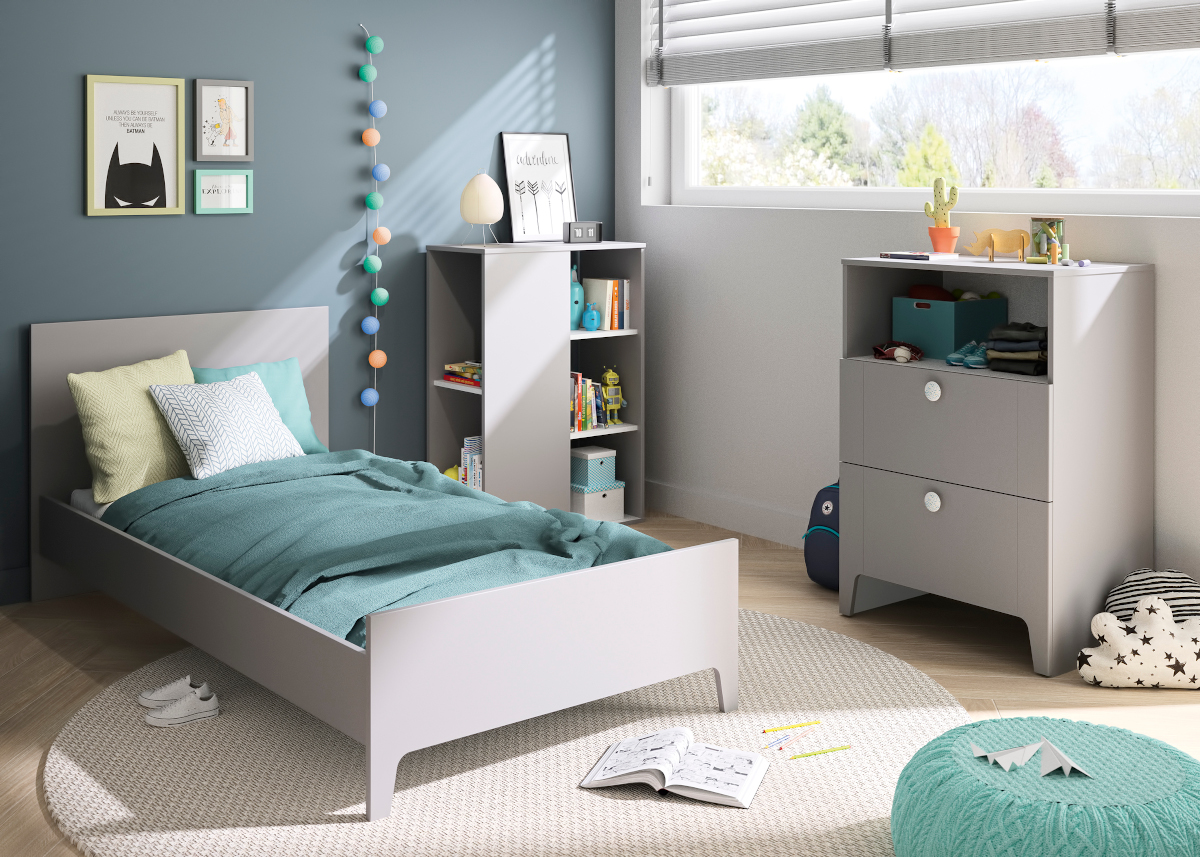 Η χαμηλή γωνιακή βιβλιοθήκη περιλαμβάνει μια ράγα ωστε να μπορείτε να κρεμάσετε κάτι άν θέλετε. Τα πάντα μπορούν να αποθηκευτούν με εύκολη πρόσβαση από τα παιδιά. Βιβλία, παιχνίδια και αξεσουάρ: μπορεί να τα βάλετε όλα! Η βιβλιοθήκη μπορεί να αποσπαστεί από το συμπαγές κρεβάτι για να την τοποθετήσετε όπου θέλετε. Το υπέροχο γκρίζο χρώμα της τονίζει τις καθαρές γραμμές της.