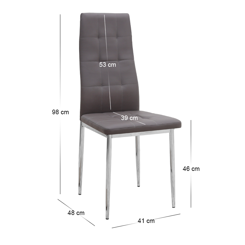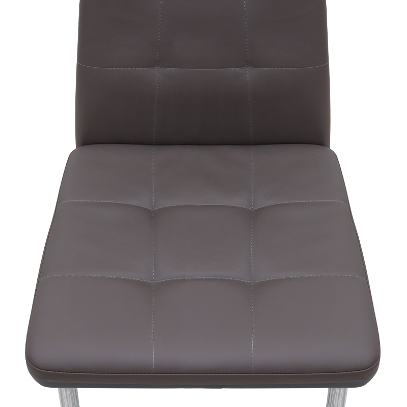 Η καρέκλα Rosa διαθέτει κάθισμα από τεχνόδερμα PU σε καφέ χρώμα και μεταλλικά πόδια χρωμίου, προσφέροντας αντοχή και πρακτικότητα στην καθημερινή χρήση. Ο λιτός, μοντέρνος σχεδιασμός της την κάνει κατάλληλη για κάθε τύπο τραπεζαρίας, οικιακής ή επαγγελματικής, προσφέροντας μια διακριτική αλλά κομψή παρουσία στον χώρο.