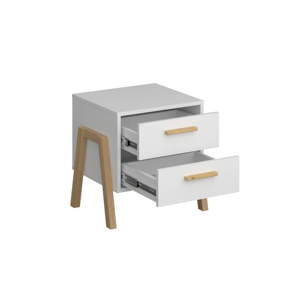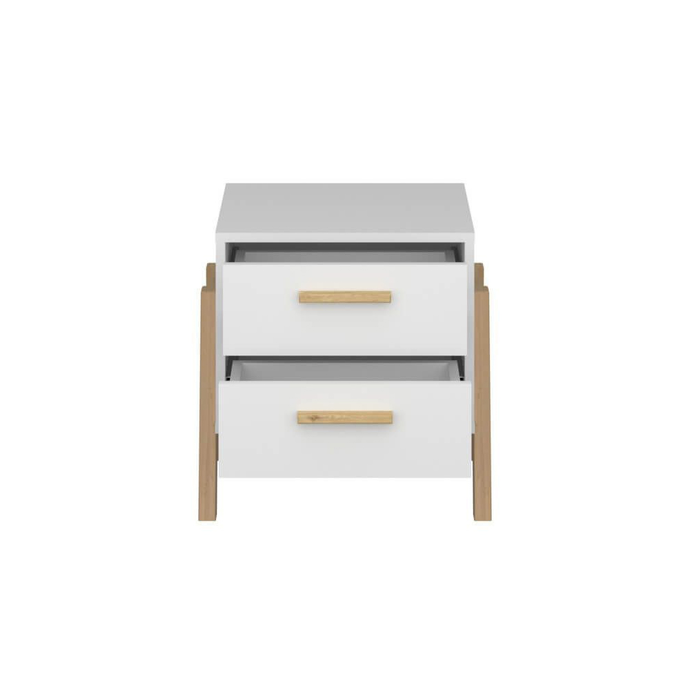 Belle Bedside of exceptional quality and high durability, in a special white colour, with sonoma details. The bedside has storage space for the decoration of your personal items. Furniture legs and handles made of natural wood.