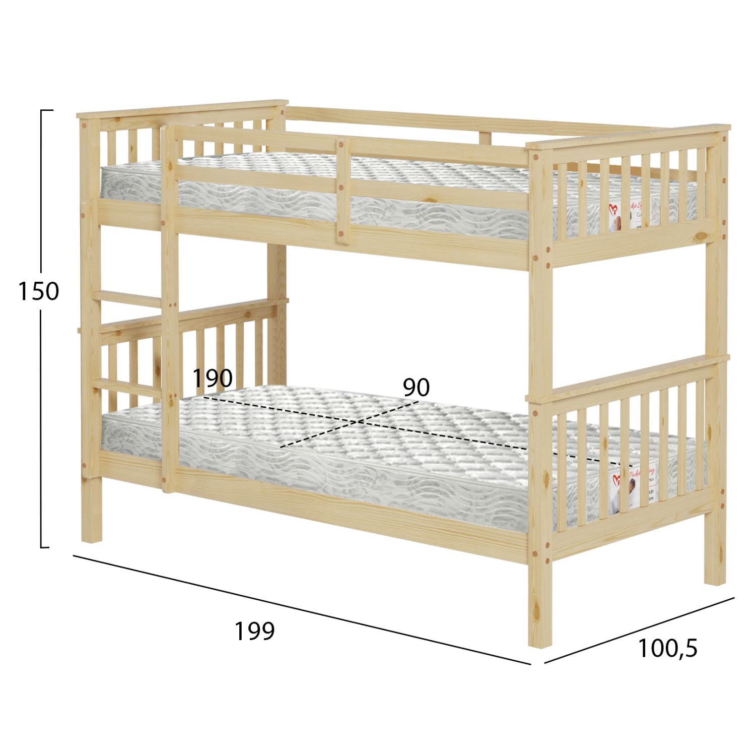 Η παιδική κουκέτα LANTAI σε διάσταση για στρώματα 90×190εκ, είναι κατασκευασμένη από ξύλο πεύκου σε ΦΥΣΙΚΟ χρώμα. Η κουκέτα με τα ψηλά σχετικά πόδια, διαθέτει περιμετρικά κάγκελα και σκάλα πρόσβασης στο επάνω κρεβάτι, ενώ τα στρώματα τοποθετούνται σε τάβλες από κόντρα-πλακέ ξυλεία.