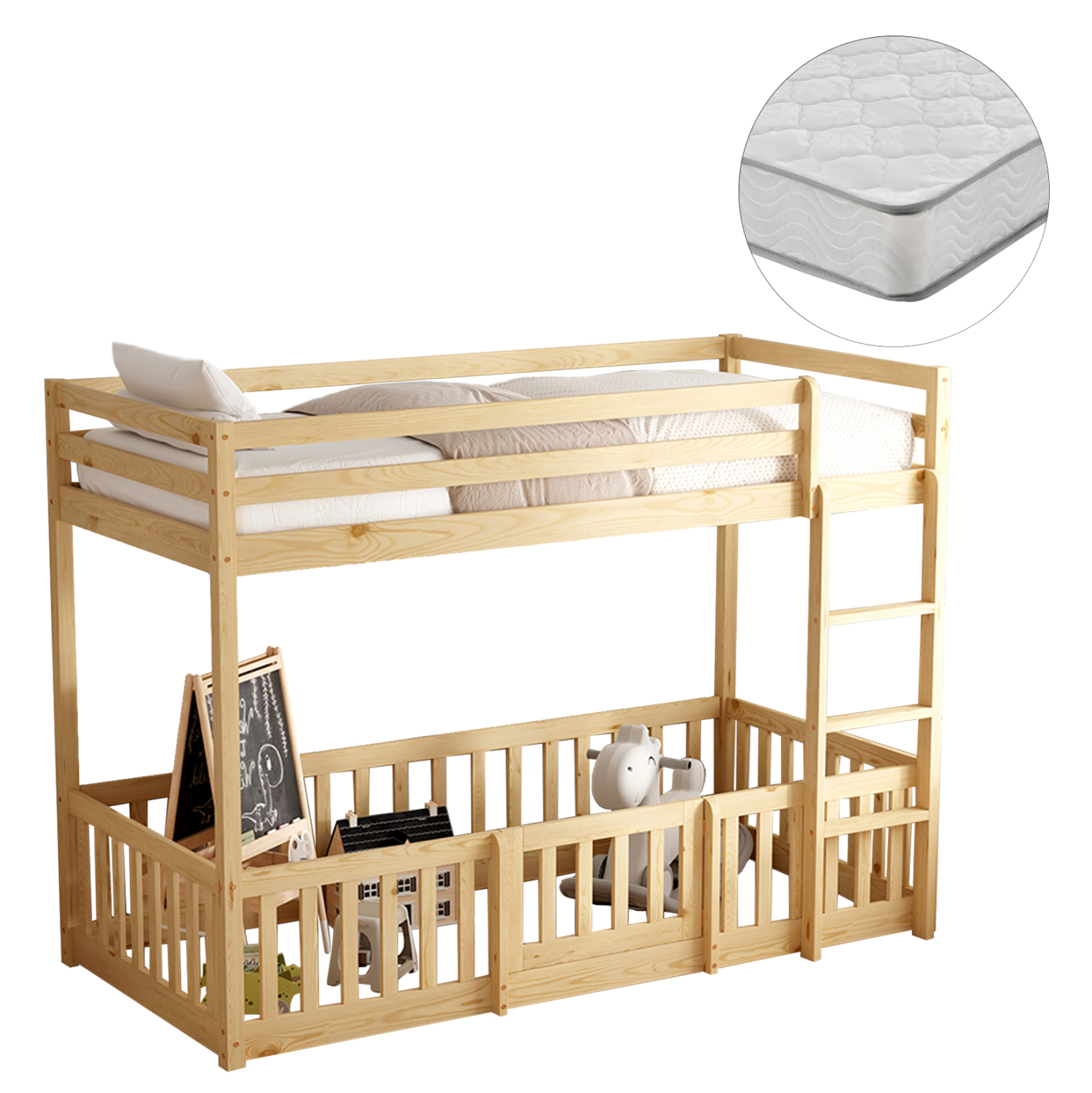 Η παιδική κουκέτα PLAYKID σε διάσταση για στρώμα 90×190εκ, είναι κατασκευασμένη από ξύλο πεύκου σε ΦΥΣΙΚΟ χρώμα. Η κουκέτα διαθέτει περιμετρικά κάγκελα και σκάλα πρόσβασης στο επάνω κρεβάτι και το κάτω μέρος της κουκέτας είναι διαμορφωμένο ως «παρκάκι» δραστηριοτήτων, ενώ το στρώμα τοποθετείται σε τάβλες από κόντρα-πλακέ ξυλεία.