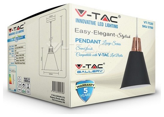 Κρεμαστό Φωτιστικό V-TAC Μεταλλικό Μαύρο με Φινίρισμα Άμμου και ντουί Ε27 Ф220