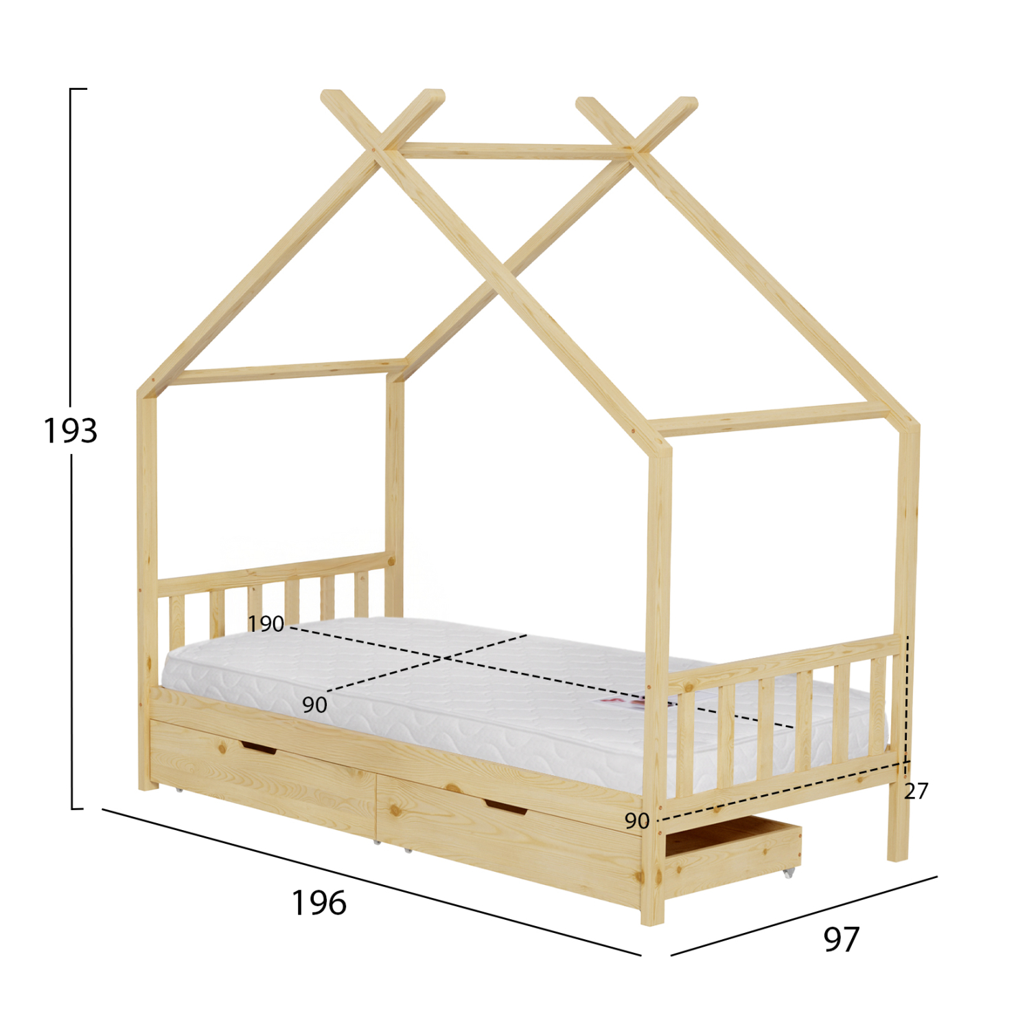 Το παιδικό κρεβάτι KLARICE τύπου Montessori σε διάσταση για στρώμα 90×190εκ, είναι κατασκευασμένο από ξύλο πεύκου σε ΦΥΣΙΚΟ χρώμα. Όλο το κρεβάτι έχει σχήμα σπιτιού και διαθέτει 2 συρτάρια στο κάτω μέρος ως αποθηκευτικό χώρο αλλά και προστατευτικό κάγκελα σε 2 πλευρές, ενώ το στρώμα τοποθετείται σε τάβλες από κόντρα-πλακέ ξυλεία.