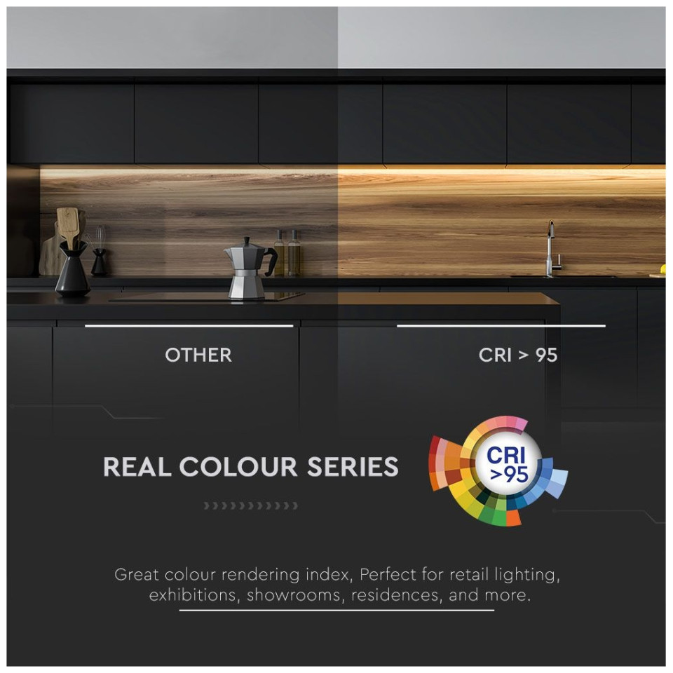 Δείκτης χρωματικής απόδοσης (CRI)> 90 . Το CRI δείχνει την πιστότητα στην αναπαραγωγή των διαφορετικών χρωματικών περιοχών μιας πηγής φωτός. Όσο πιο κοντά είναι στα 100, τόσο πιο φωτεινά, πιο φυσικά και αληθινά στην πραγματικότητα είναι τα χρώματα.