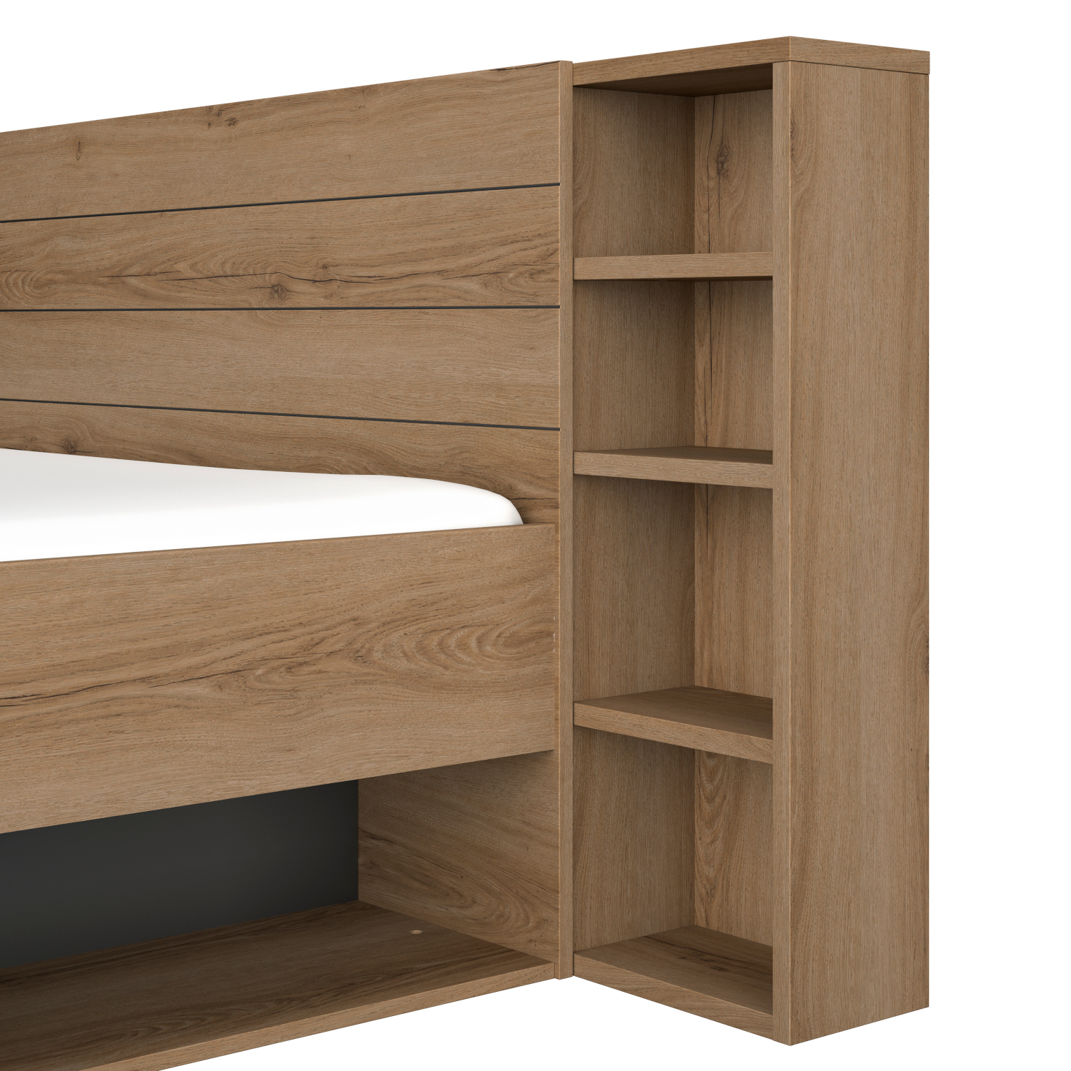 Το κεφαλάρι του κρεβατιού διαθέτει ενσωματωμένα ράφια, προσφέροντας επιπλέον αποθηκευτικό χώρο για βιβλία, διακοσμητικά και άλλα προσωπικά αντικείμενα.