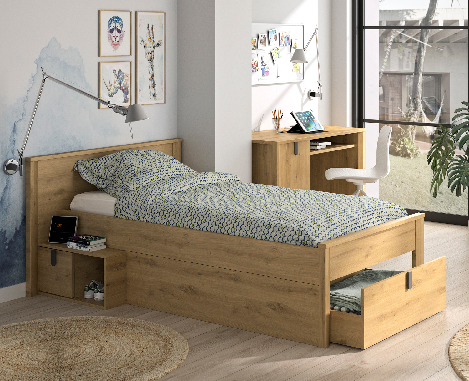 Το μονό κρεβάτι Lugano είναι όμορφο και πρακτικό. Οι διαστάσεις του είναι 207×113εκ.( ύψος 80εκ. ) και το χρώμα του artisan oak. Η λειτουργικότητα του Lugano είναι εντυπωσιακή. Διαθέτει ένα συρτάρι στο ποδαρικό και έναν αποθηκευτικό χώρο στο πλάι με συρόμενη πόρτα. Μπορείτε να τοποθετήσετε στρώμα είτε 90×190εκ. είτε 90×200εκ. Το μονό κρεβάτι Lugano είναι γαλλικής κατασκευής. Συνδυάστε το με τα υπόλοιπα έπιπλα της σειράς Lugano.