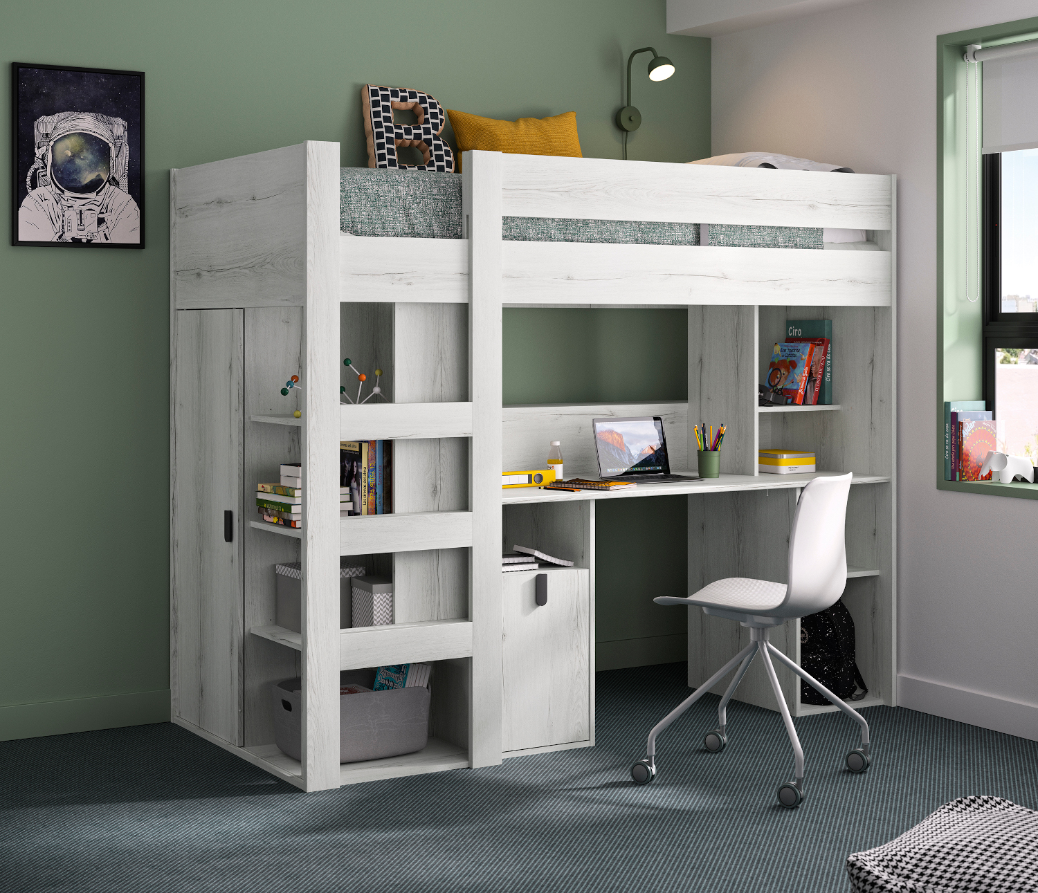 Το κρεβάτι Lugano είναι ένα εξαιρετικό "όλα σε ένα" επιπλο για το παιδικό υπνοδωμάτιο. Είναι στιβαρό και πρακτικό. Περιλαμβάνει κρεβάτι με σκάλα, γραφείο , βιβλιοθήκη και ντουλάπα. Είναι ιδανικό για δωμάτια με περιορισμένο χώρο. Οι διαστάσεις του είναι 205×99εκ. ( ύψος 169εκ. ) και το χρώμα του whitewashed oak. Διαθέτει επίσης βάση στήριξης για το στρώμα. Το "all-in-one" κρεβάτι Lugano είναι γαλλικής κατασκευής.