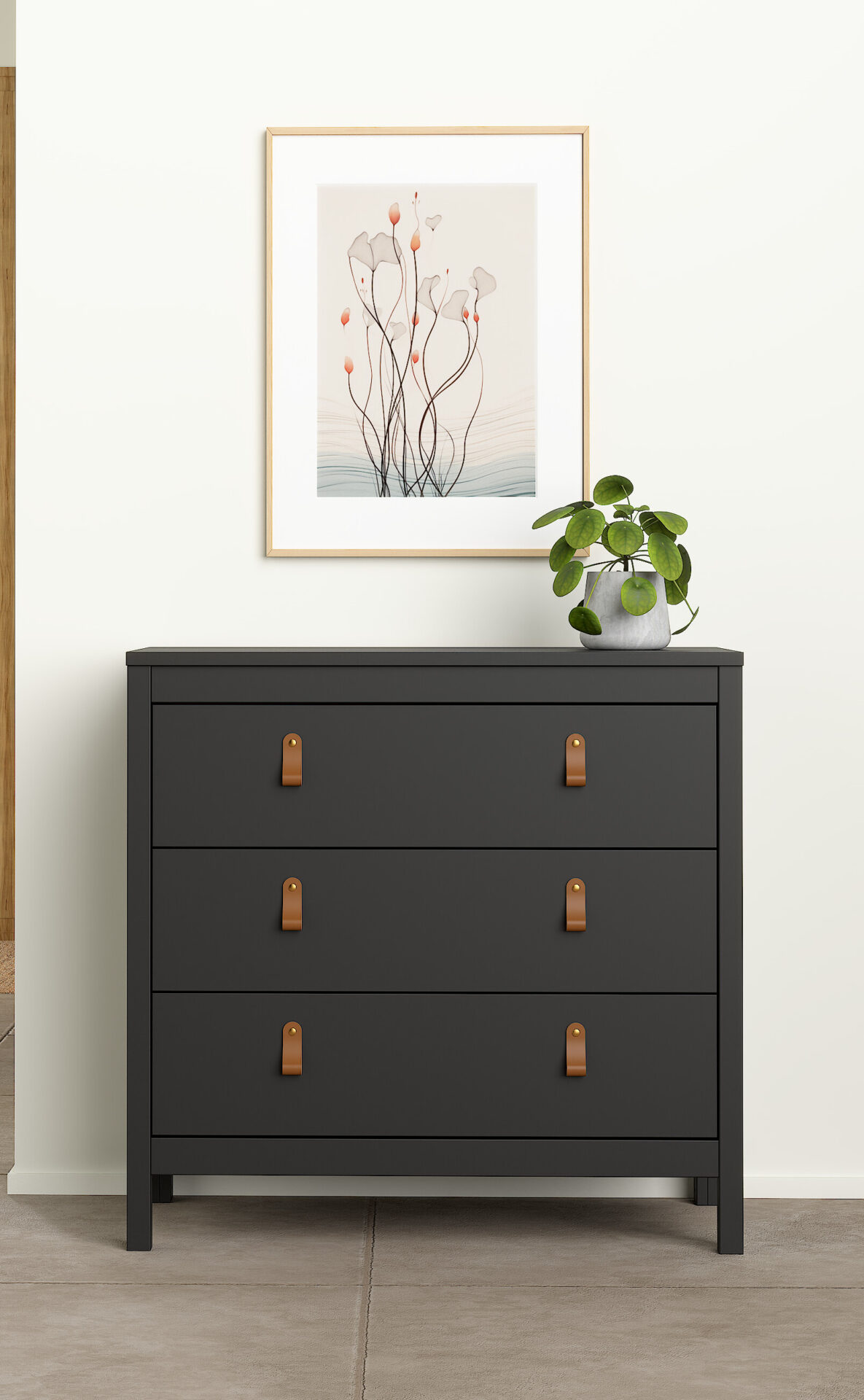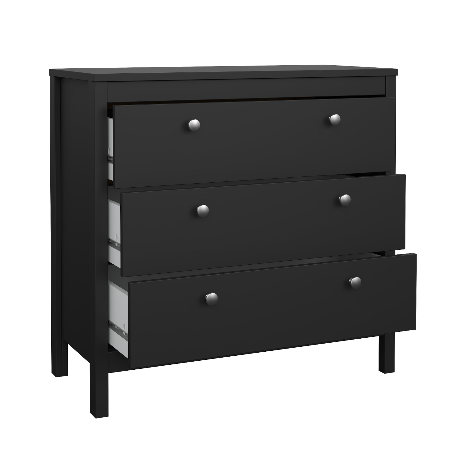 Η συρταριέρα Madrid είναι μοντέρνα και πρακτική. Οι διαστάσεις της είναι 82,3×38,4εκ. ( ύψος 79,7εκ. ) και το χρώμα της είναι μαύρο. Διαθέτει 3 συρτάρια. . Μπορείτε να προσαρμόσετε την εμφάνισή της επιλέγοντας ανάμεσα σε 2 διαφορετικά σετ πόμολα ( δερματίνη ή μεταλλικά ) . Η συρταριέρα Madrid κατασκευάζεται στη Δανία.
