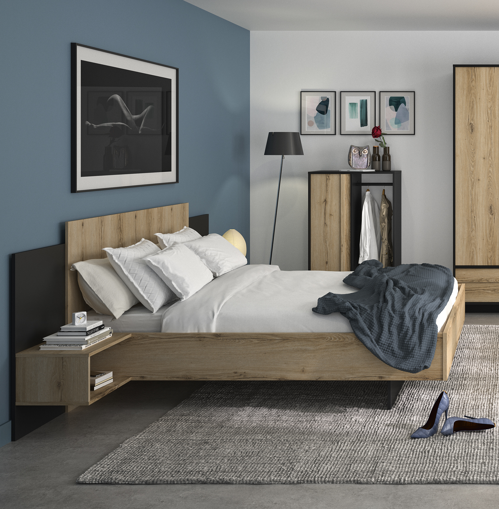 Το διπλό κρεβάτι Mimizan αποτελεί μια ολοκληρωμένη πρόταση για το υπνοδωμάτιο σας. Χάρη στον ιδιαίτερο σχεδιασμό του, το κρεβάτι με τα κομοδίνα μοιράζονται το ίδιο κεφαλάρι, κάτι που δίνει μια ξεχωριστή όψη στο έπιπλο. Οι διαστάσεις του είναι 255×206εκ. και παίρνει στρώμα 160×200εκ. Το χρώμα του κρεβατιού Mimizan είναι ένας υπέροχος συνδυασμός helvezia δρυός και μαύρου. Το κρεβάτι Mimizan είναι γαλλικής κατασκευής. Συνδυάστε το με τα υπόλοιπα έπιπλα της σειράς Mimizan.