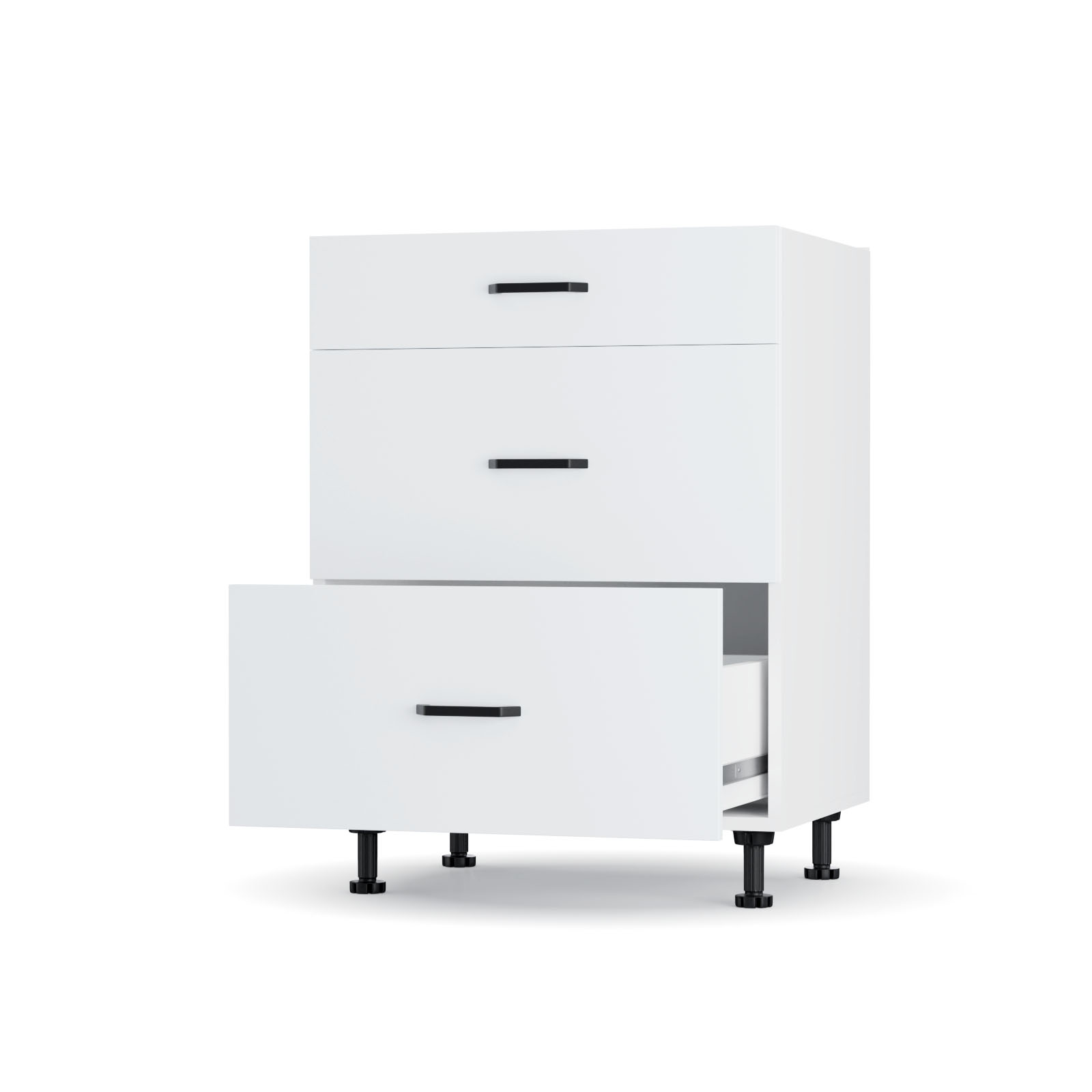 Modest Επιδαπέδιο Ντουλάπι, Ευρωπαϊκής κατασκευής, εξαιρετικής ποιότητας και υψηλής αντοχής σε λευκή απόχρωση. Το έπιπλο διαθέτει τρία συρτάρια για την αποθήκευση αντικειμένων καθώς και τρία χερούλια. Μπορείτε να το συνδυάσετε με τα υπόλοιπα ντουλάπια κουζίνας της σειράς Modest.