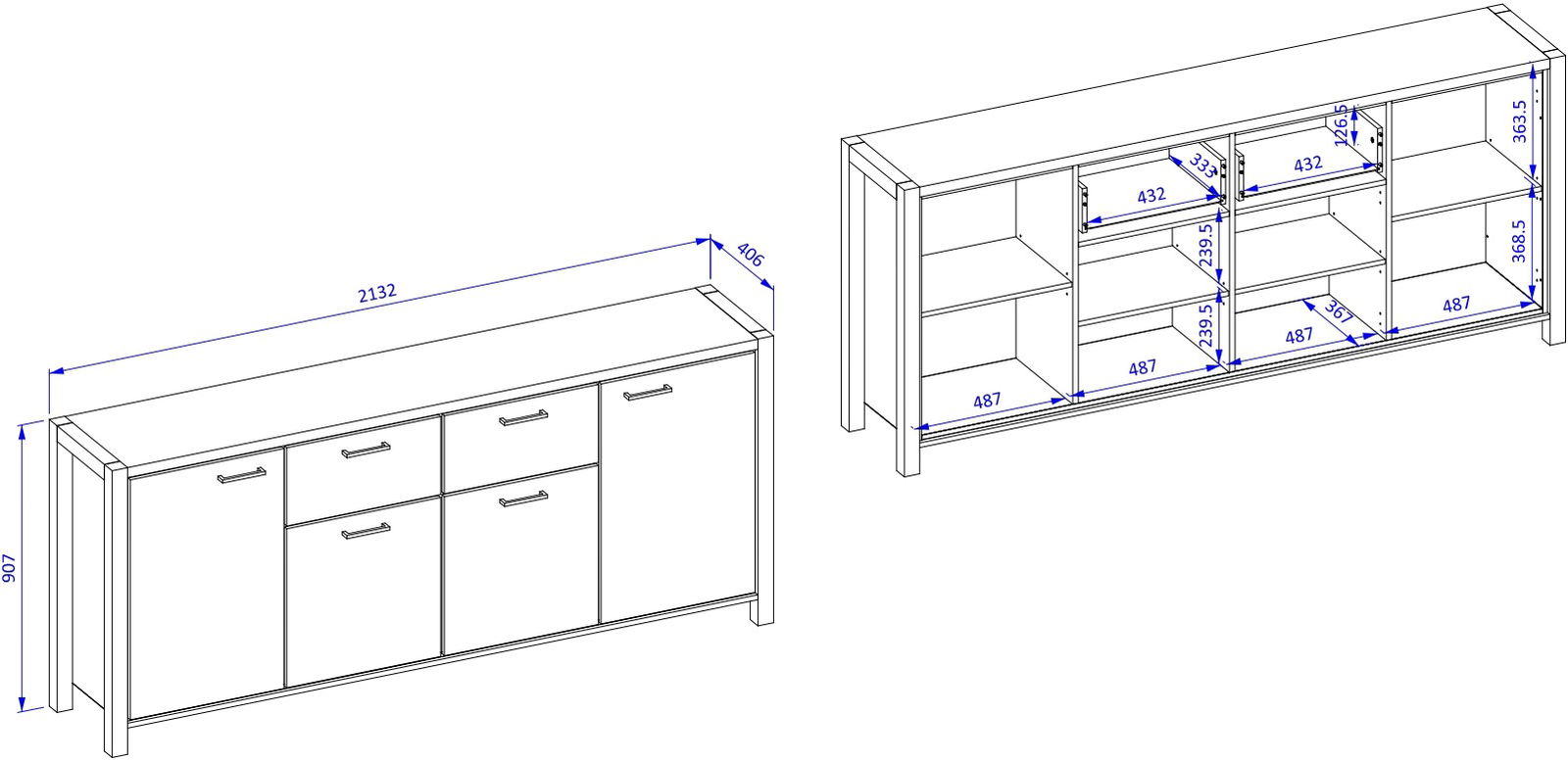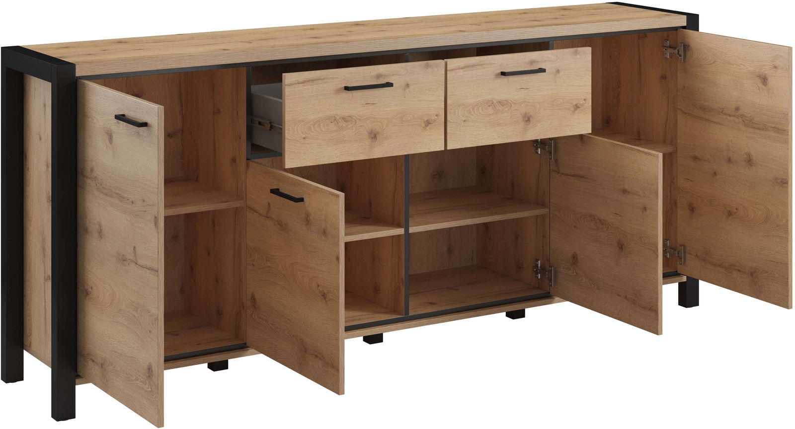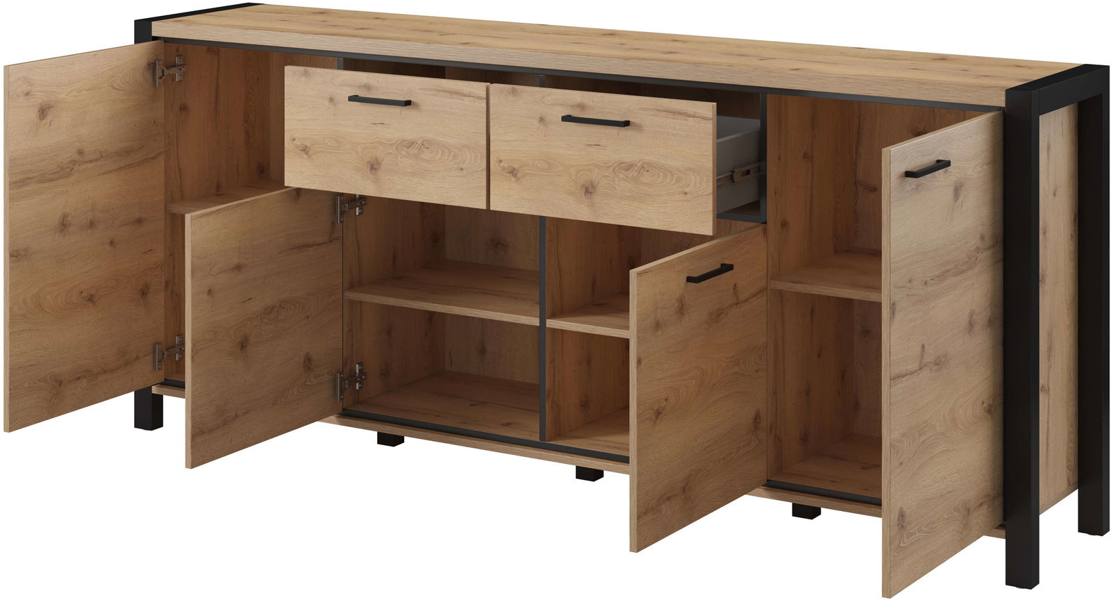 Μπουφές Amelie 4D2S σε μοντέρνο, industrial σχεδιασμό. Είναι σίγουρο πως θα ανανεώσετε τον χώρο σας, προσδίδοντας του μια κομψή νότα, χάρις τις μαύρες λεπτομέρειες και την γυάλινη πρόσοψη. Διαθέτει πρακτικές διαστάσεις και ευρύχωρο αποθηκευτικό χώρο που τον καθιστούν ιδανική επιλογή για κάθε σαλόνι. Συνδυάστε τον και με τα υπόλοιπα έπιπλα της σειράς Amelie για μια ξεχωριστή σύνθεση.