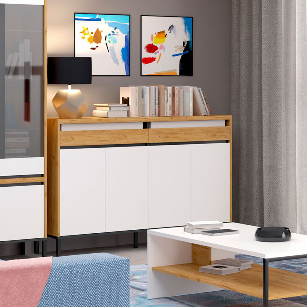 Μπουφές Palmor, Ευρωπαϊκής Κατασκευής, εξαιρετικής ποιότητας και υψηλής αντοχής, σε ιδιαίτερο συνδυασμό χρωμάτων χρυσό δρυς με λευκό, και ανθρακί λεπτομέρειες.