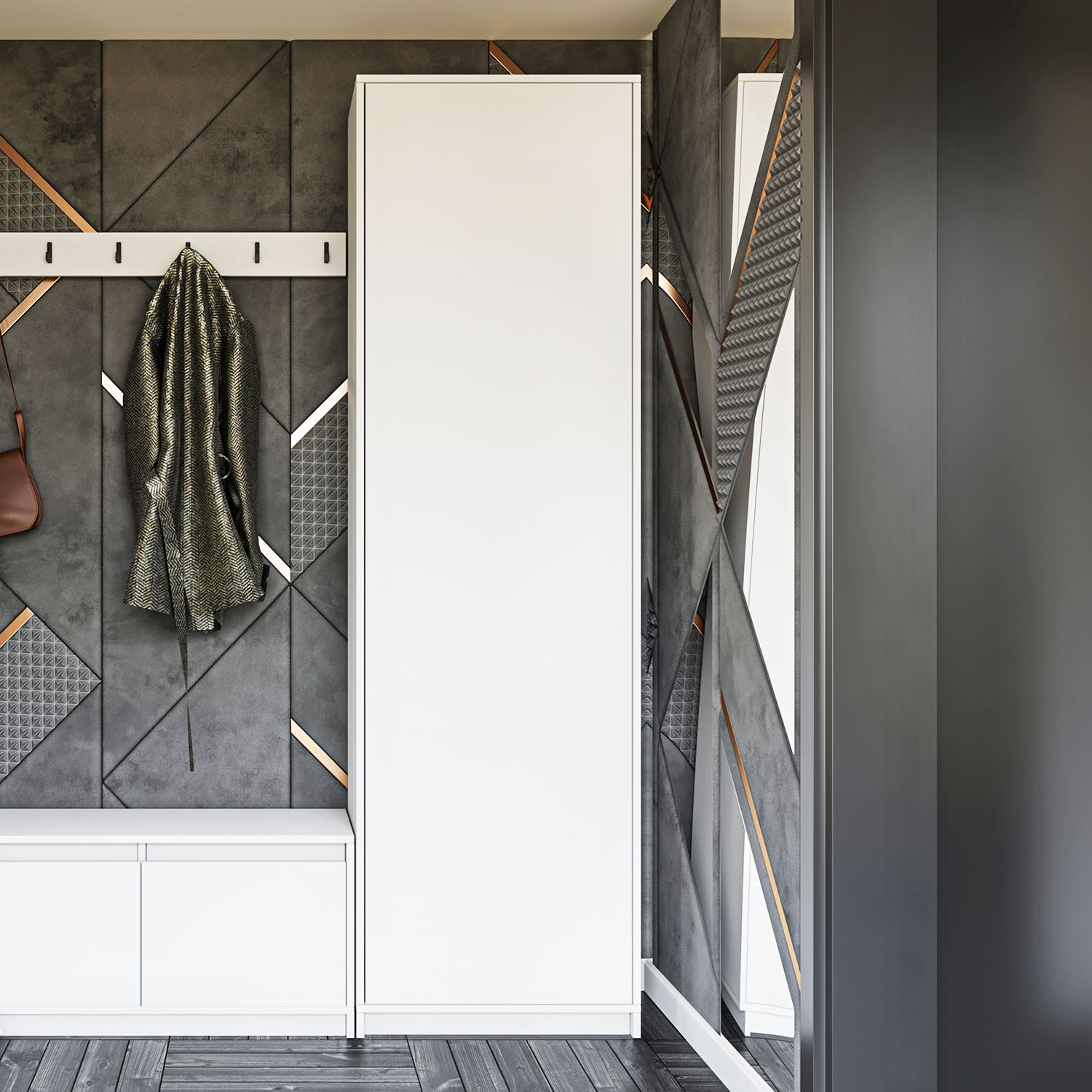 • Ένα ανοιγόμενο φύλλο, όπου εσωτερικά διαθέτει δύο ράφια, για την τοποθέτηση προσωπικών αντικειμένων, και μία ράγα για κρέμασμα.