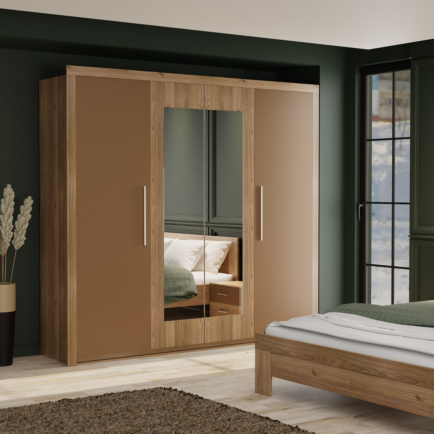 Juliet Ντουλάπα 242×220 Τετράφυλλη με 2 καθρέπτες. Στο εσωτερικό της διαθέτει στα δύο δεξιά φύλλα 4 ράφια και στα δύο αριστερά φύλλα διαθέτει στο επάνω μέρος ένα ράφι και απο κάτω μια βέργα για να κρεμάτε τα ρούχα σας. Την ντουλάπα συμπληρώνουν αρμονικά τα λεπτά και κομψά χερούλια που διαθέτει σε χρώμα Inox. Μια ντουλάπα που αν την επιλέξετε θα μείνετε σίγουρα ευχαριστημένοι. Μπορείτε να την συνδυάσετε με άλλα έπιπλα της σειράς Juliet για να δημιουργήσετε ένα ολοκληρωμένο σετ κρεματοκάμαρας.