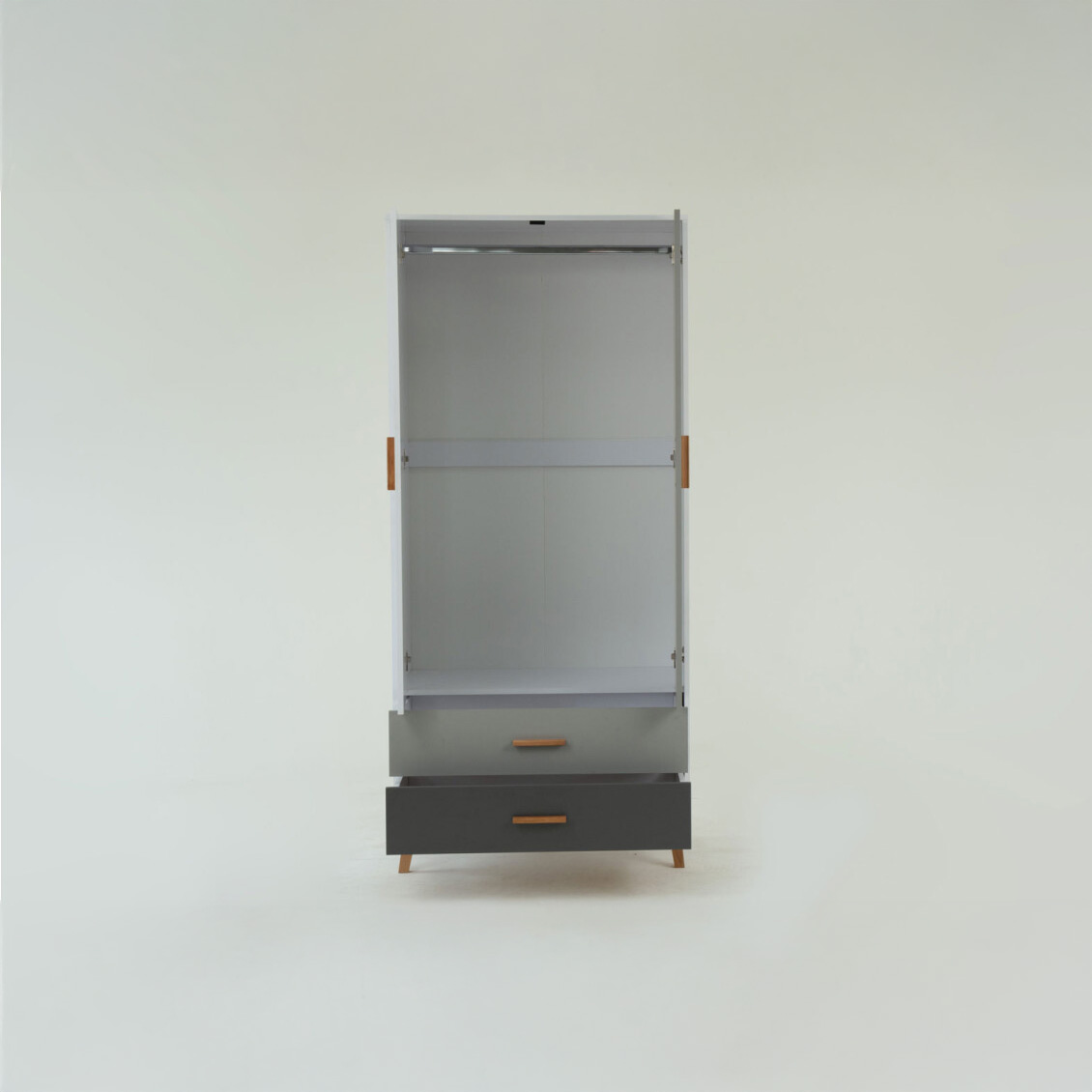 Δίφυλλη Ανοιγόμενη Ντουλάπα Timmy, Ευρωπαϊκής Κατασκευής, εξαιρετικής ποιότητας και υψηλής αντοχής, σε ιδιαίτερο συνδυασμό τριών χρωμάτων λευκό, γραφίτη, γκρι.
