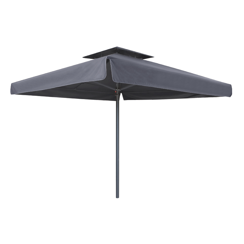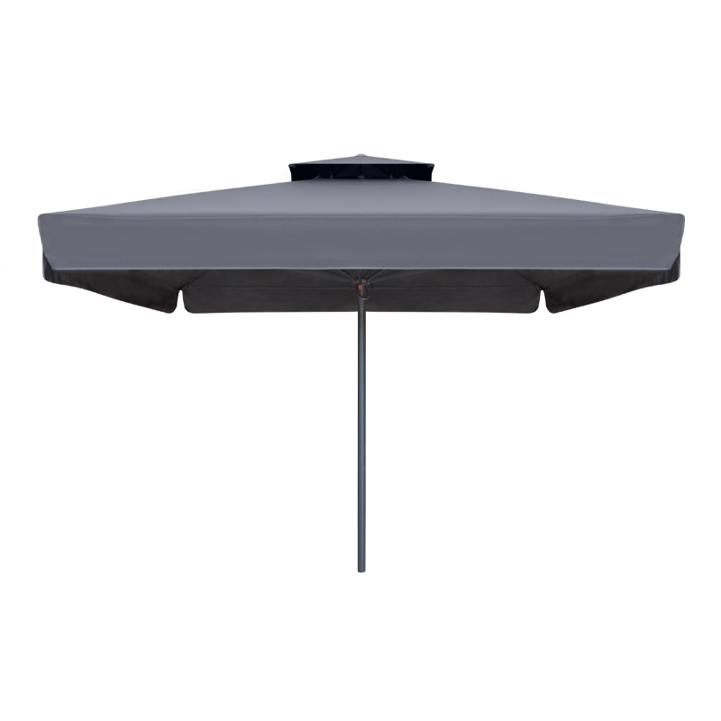 Τετράγωνη ομπρέλα αλουμινίου με τηλεσκοπικό μηχανισμό και διπλό αεραγωγό που επιτρέπει την κυκλοφορία του αέρα μειώνοντας ταυτόχρονα την πίεση του. Ιδανική επιλογή για επαγγελματική χρήση όπως beach bars, πισίνες και χώρους εστίασης.
