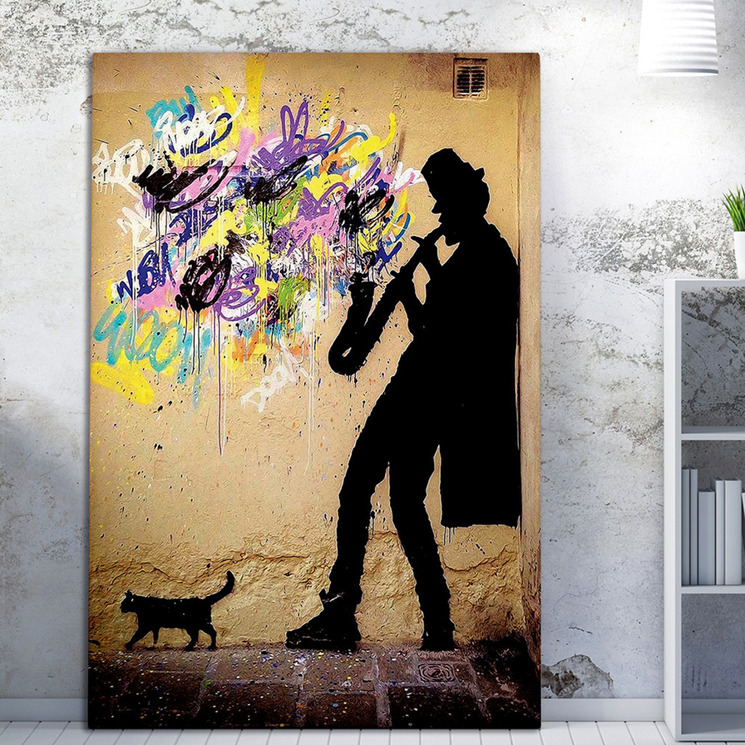 Ένας πίνακας τοίχου μεταμορφώνει τον τρόπο που αντιλαμβανόμαστε έναν χώρο. Διακοσμήστε, λοιπόν, τον χώρο σας με την καινούργια σειρά πινάκων τοίχου GOBI! Αυτός ο πολύχρωμος πίνακας που απεικονίζει την φιγούρα ενός σαξοφωνίστα σε πολύχρωμο τοίχο, έχει υλοποιηθεί σε ψηφιακά εκτυπωμένο καμβά (50% βαμβάκι-50% πολυεστέρας) σε πλαίσιο από ξύλο.