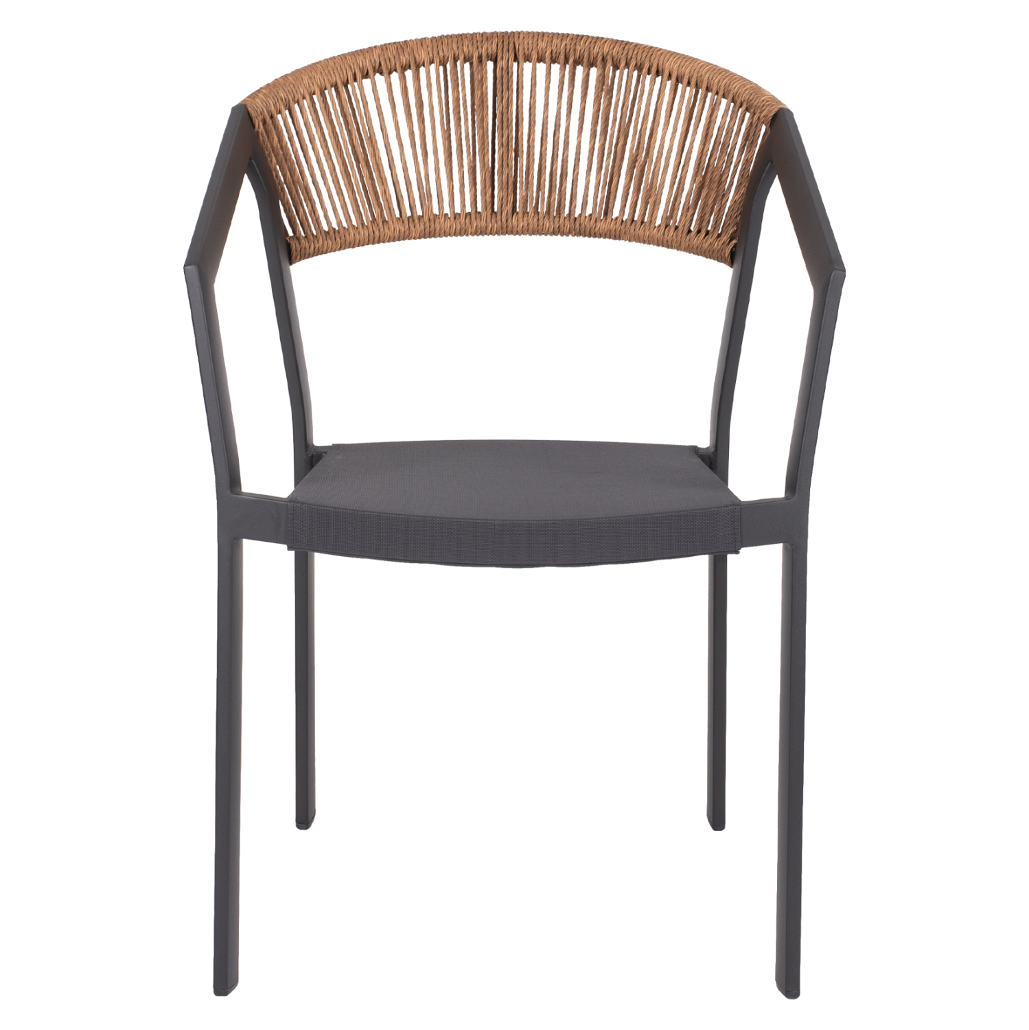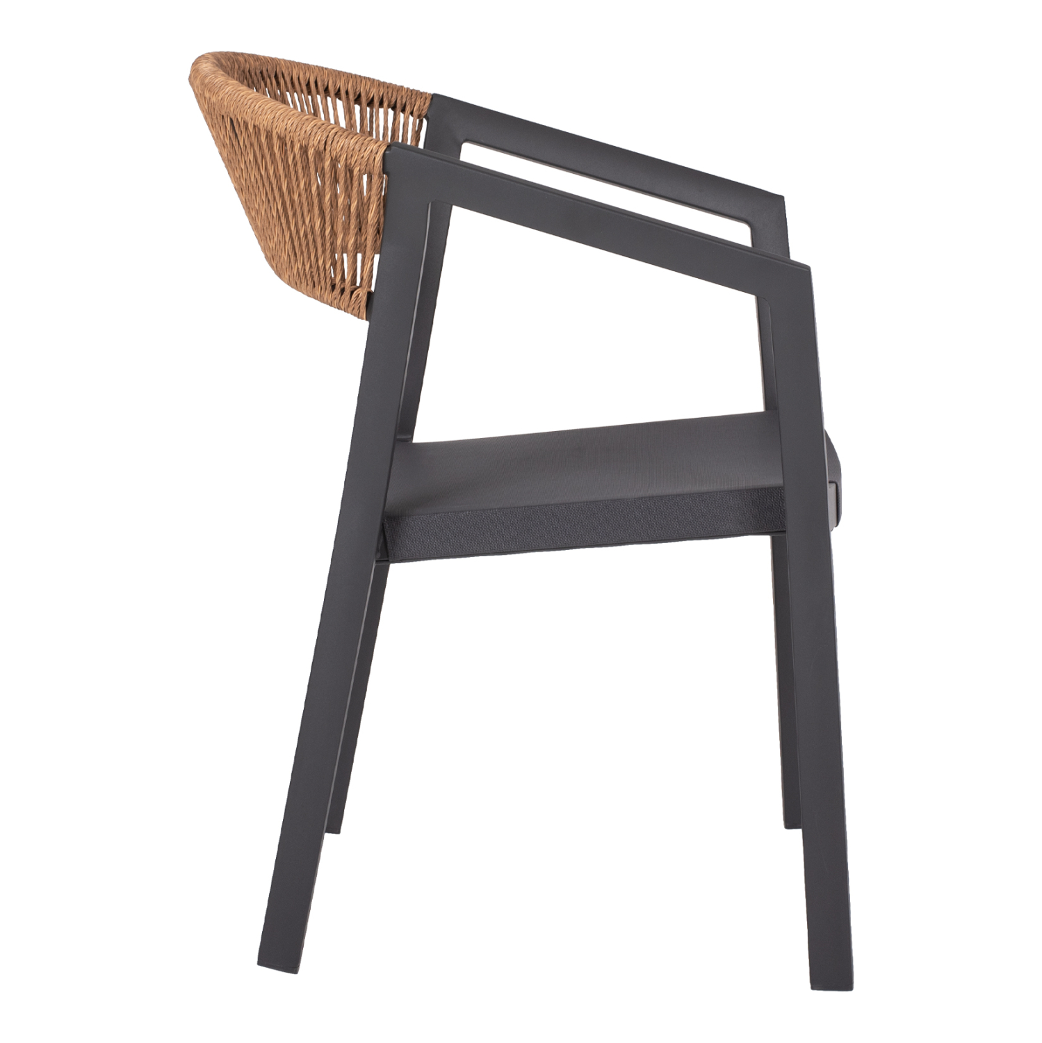 Η πλάτη της πολυθρόνας είναι επενδυμένη με πολυεστερικό RATTAN. Στα περισσότερα έπιπλα κήπου και γενικά σε έπιπλα για εξωτερικούς χώρους χρησιμοποιείται συνθετικό υλικό από PVC, δηλαδή τεχνητές ίνες υψηλής ποιότητας. Αυτό δίνει στην κατασκευή εξαιρετική αντοχή και ανθεκτικότητα σε ακραίες συνθήκες ζέστης ή κρύου.