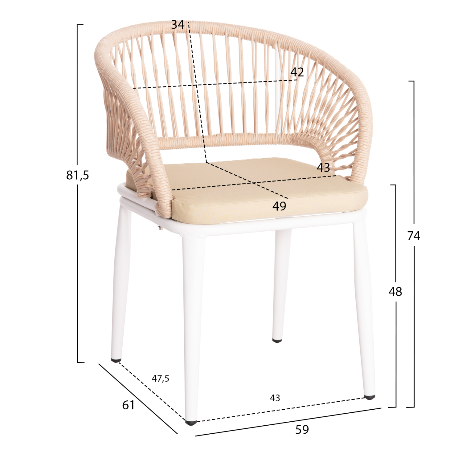 Η πολυθρόνα MAGNET είναι σχεδιασμένη να αγκαλιάζει το σώμα χάρη στην ημικυκλική πλάτη που είναι επενδυμένη με πολυεστερικό σχοινί terylene σε χρώμα ΜΠΕΖ. Το μαξιλάρι στο κάθισμα την καθιστά άνετη και βολική. Ο σκελετός είναι κατασκευασμένος από αλουμίνιο σε ΛΕΥΚΟ χρώμα. Επίσης, το γεγονός ότι είναι στοιβαζόμενη την κάνει ιδιαιτέρως πρακτική αφού μπορείτε να την αποθηκεύσετε στον μικρότερο δυνατό χώρο.