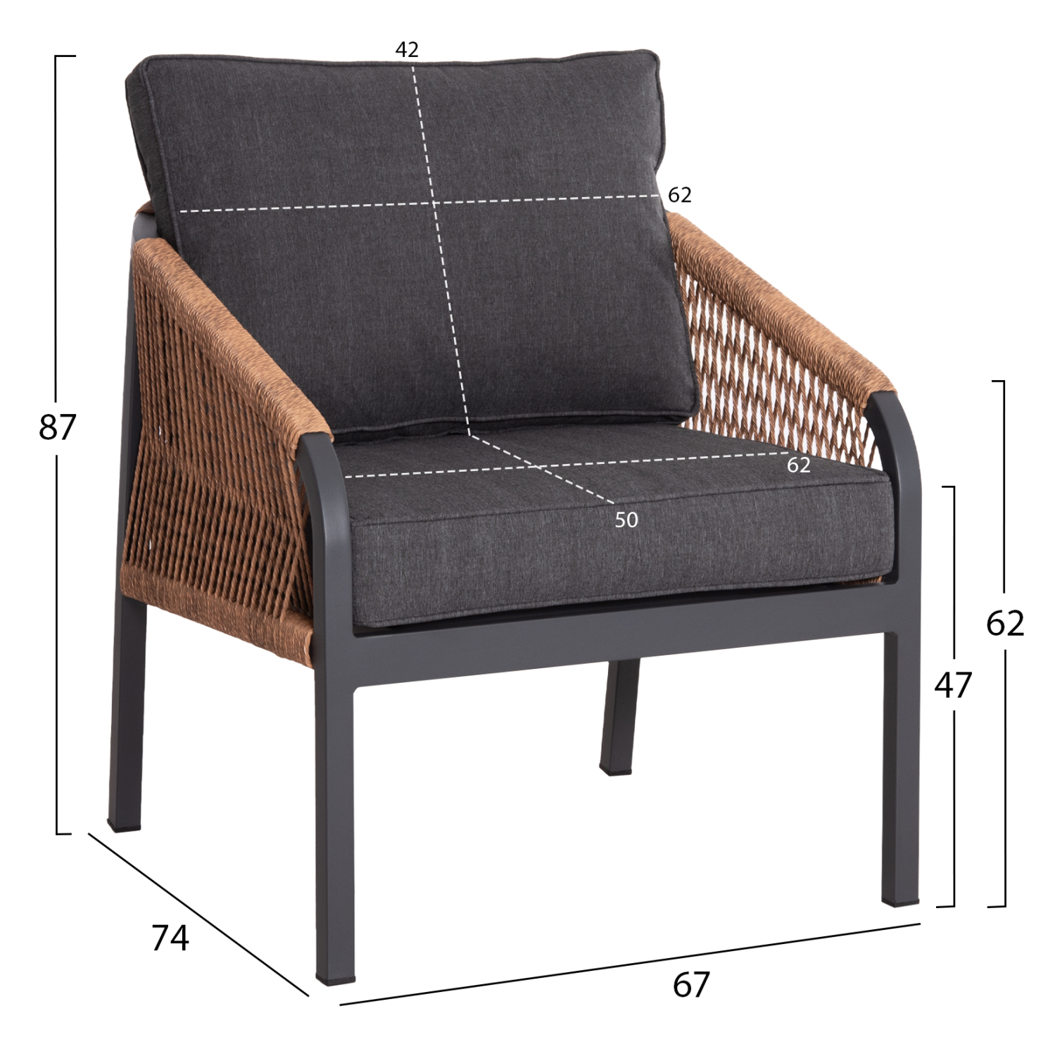 Η πολυθρόνα αλουμινίου MAYBEL σε ΑΝΘΡΑΚΙ χρώμα είναι ακόμα μια νέα πρόταση για τον εξωτερικό σας χώρο. Ουσιαστικά δεν έχει ξεχωριστά μπράτσα αλλά η πλάτη είναι ενιαία με τα μπράτσα αγκαλιάζοντας το σώμα. Πρόκειται για μια πανέμορφη πολυθρόνα με χαμηλή πλάτη, πλαϊνά, και κάθισμα από συνθετικό σχοινί (P.E. Rattan twisted) άριστης ποιότητας. Το ιδιαίτερο χαρακτηριστικό αυτής της πολυθρόνας είναι ότι διαθέτει αναπαυτικά μαξιλάρια τόσο στο κάθισμα, όσο και στην πλάτη, επίσης σε ΑΝΘΡΑΚΙ χρώμα.