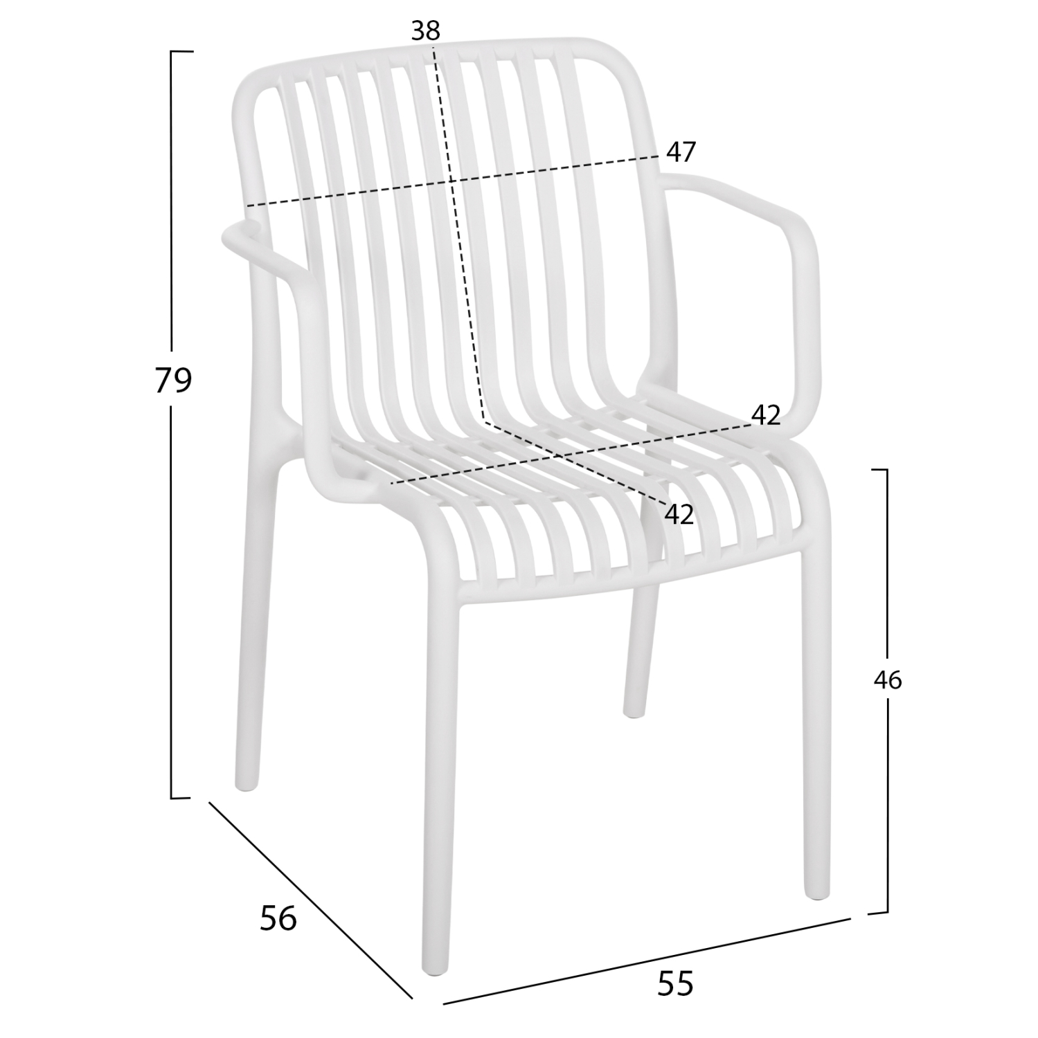 Η πολυθρόνα CONVEE είναι μια κλασσική πολυθρόνα εξωτερικού χώρου που θα καλύψει κάθε σας ανάγκη στην αυλή ή το μπαλκόνι σας. Είναι ποιοτική και κομψή στην όψη, ενώ το καμπυλωτό κάθισμα στο μπροστά μέρος όπως και τα σχετικά ψηλά της μπράτσα την καθιστούν αναπαυτικότατη. Όλη η πολυθρόνα είναι από δοκούς πολυπροπυλενίου σε ΛΕΥΚΟ χρώμα. Είναι στοιβαζόμενη, ελαφριά και άνετη, ιδανική επιλογή και για επαγγελματική χρήση, όπως σε catering κτλ.