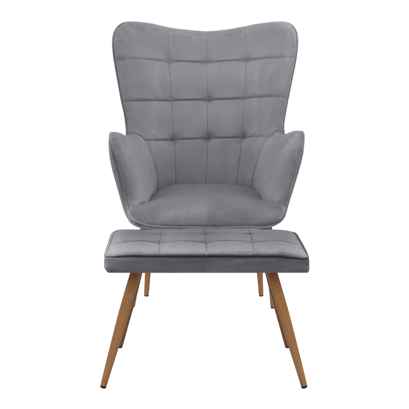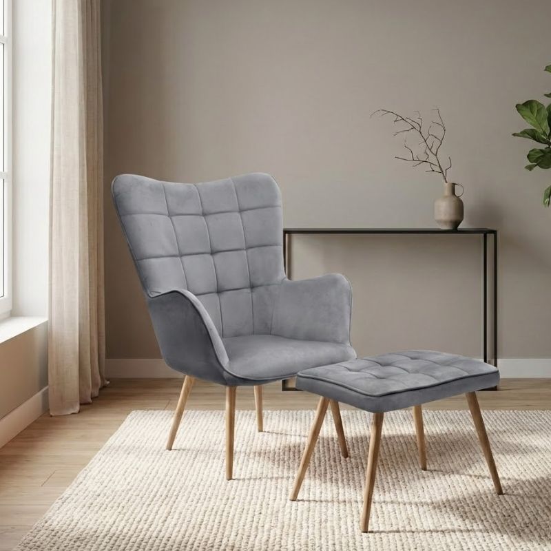 Η μπερζέρα με υποπόδιο Lily σε γκρι βελούδο είναι ένα statement κομμάτι που φέρνει στο χώρο σας ζεστασιά, κομψότητα και απόλυτη άνεση. Η πλάτη τύπου “wingback” αγκαλιάζει το σώμα προσφέροντας εργονομική στήριξη, ενώ το απαλό βελούδινο ύφασμα αναδεικνύει το design και δημιουργεί αίσθηση πολυτέλειας. Οι καπιτονέ ραφές στην πλάτη και στο υποπόδιο ενισχύουν τον χαρακτήρα της πολυθρόνας και χαρίζουν μια διαχρονική, εκλεπτυσμένη εικόνα. Τα πόδια σε φυσική απόχρωση ξύλου, κατασκευασμένα από ανθεκτικό μέταλλο, προσφέρουν σταθερότητα και ολοκληρώνουν το κομψό σύνολο. Μια ιδανική επιλογή για σαλόνια, υπνοδωμάτια, ή ακόμα και κομψούς επαγγελματικούς χώρους, που θα τραβήξει σίγουρα τα βλέμματα και θα αναβαθμίσει την αισθητική κάθε περιβάλλοντος.