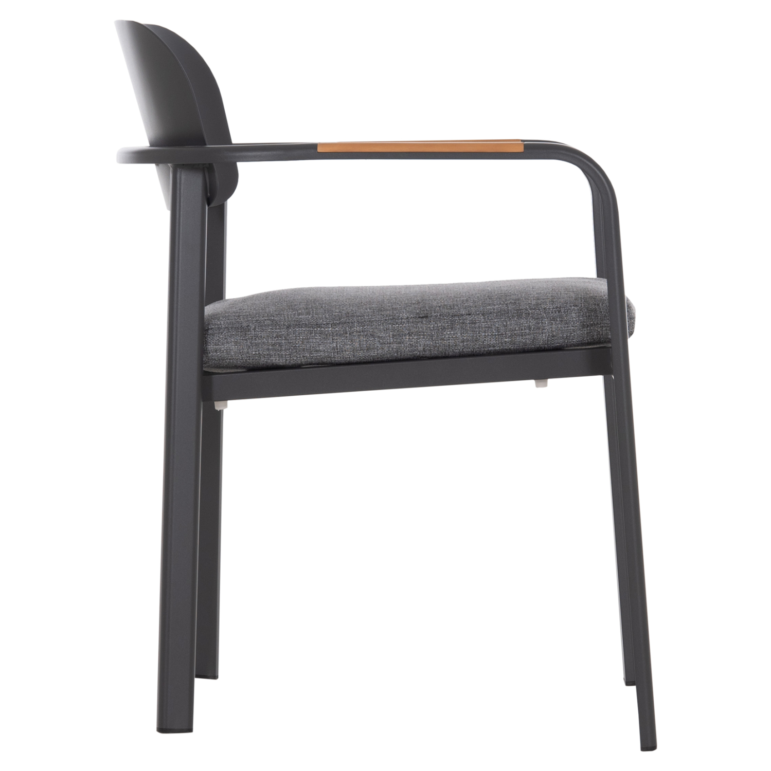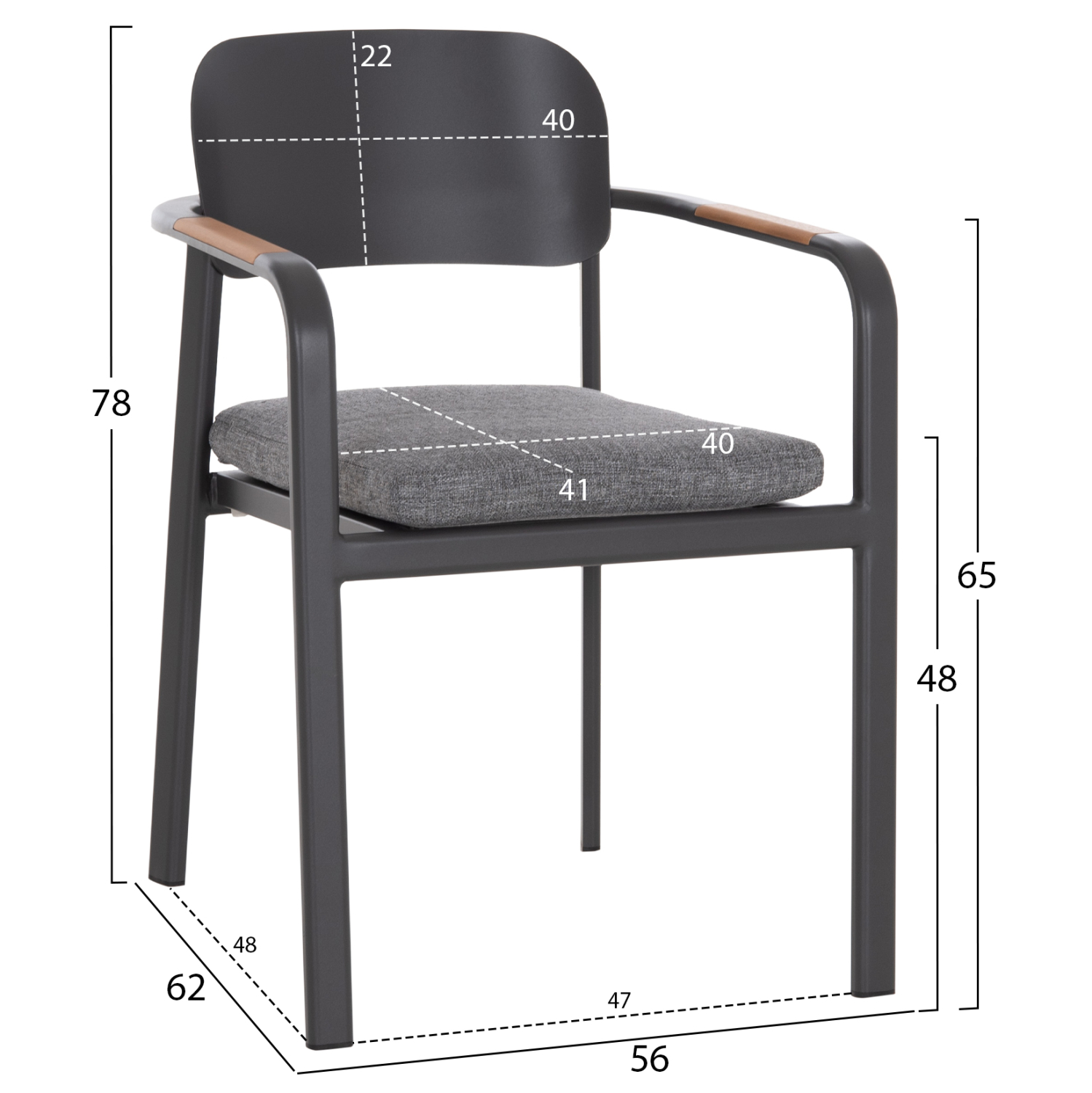 Η πολυθρόνα εξωτερικού χώρου ELARA συνδυάζει μοντέρνα αισθητική, ανθεκτικά υλικά και πρακτική λειτουργικότητα. Ο σκελετός από αλουμίνιο σε σκούρο γκρι χρώμα προσφέρει υψηλή αντοχή στις εξωτερικές συνθήκες, ενώ τα διακοσμητικά τελειώματα από ξύλο teak στα μπράτσα προσθέτουν φυσική και ζεστή πινελιά. Το μαξιλάρι καθίσματος διαθέτει κάλυμμα OLEFIN και αφρό 25D για άνεση κατά τη χρήση. Στοιβαζόμενη για εύκολη αποθήκευση.