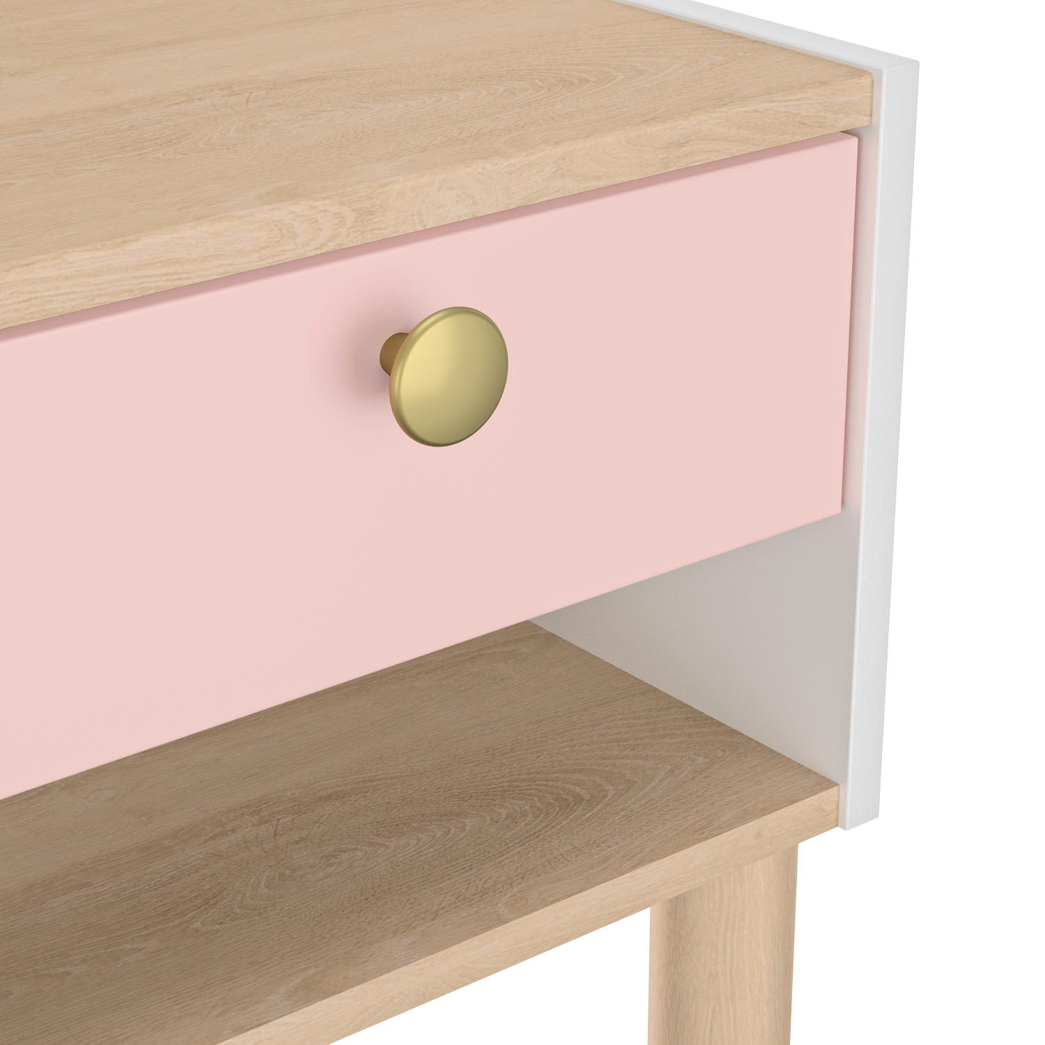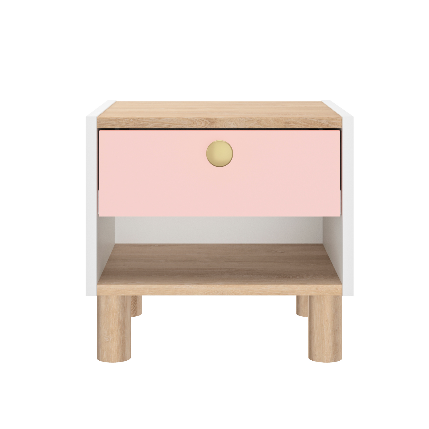 Το κομοδίνο Romy διαθέτει ένα συρτάρι και έναν ανοιχτό χώρο αποθήκευσης. Οι διαστάσεις του είναι 39×35εκ. ( ύψος 37εκ. ) και το χρώμα του ένας υπέροχος συνδυασμός λευκού, ροζ και blond oak. Το κομοδίνο Romy κατασκευάζεται στη Γαλλία. Συνδυάστε το με τα υπόλοιπα έπιπλα της σειράς Romy.