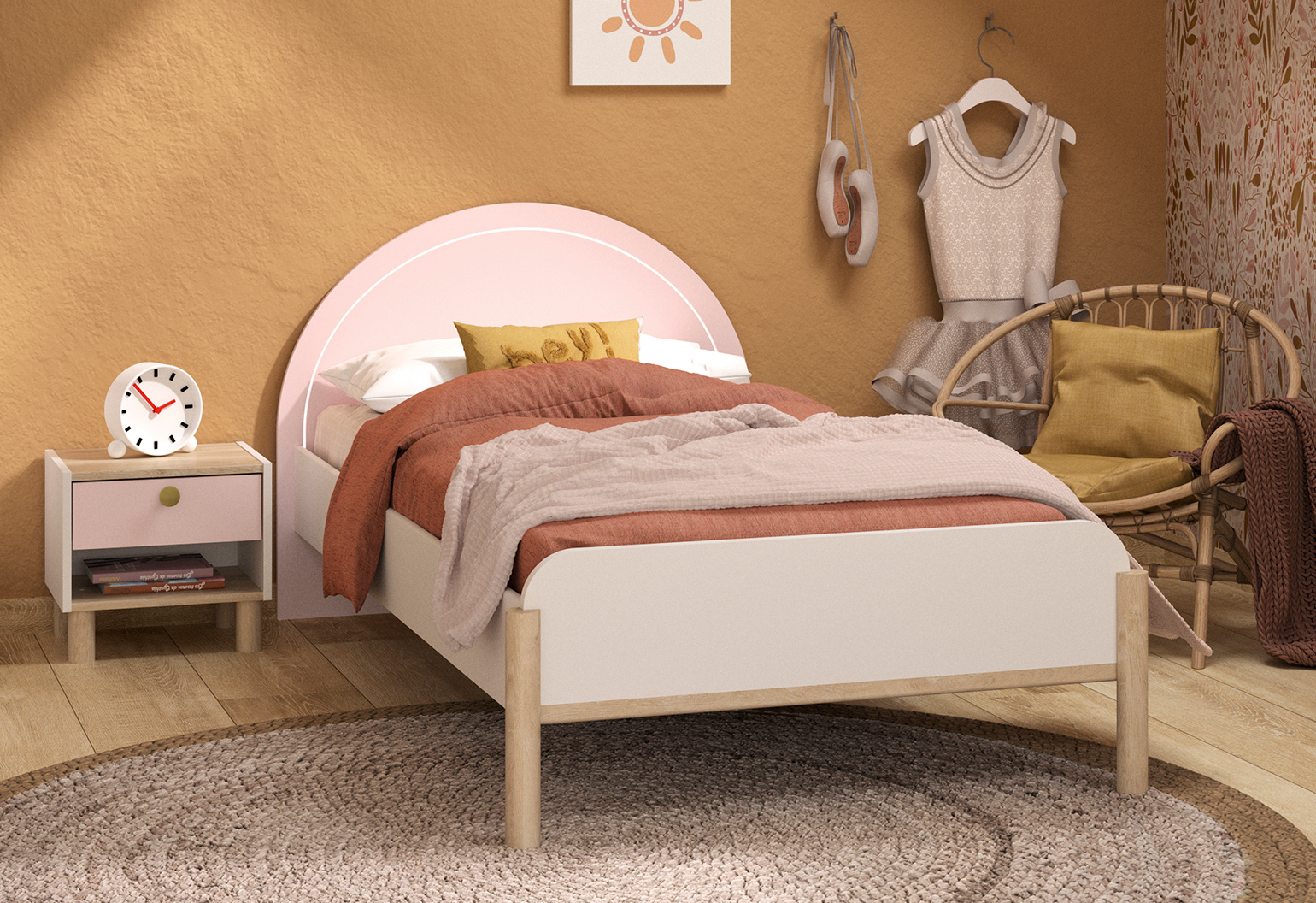 Το κρεβάτι Romy θα ομορφύνει το υπνοδωμάτιό σας. Οι διαστάσεις του είναι 102×207εκ. ( ύψος 83εκ. ) και παίρνει στρώμα 90×200εκ. Το χρώμα του ένας υπέροχος συνδυασμός λευκού , ροζ με blond oak. Διαθέτει φωτισμό led στο κεφαλάρι. Το κρεβάτι Romy είναι γαλλικής κατασκευής. Συνδυάστε το με τα υπόλοιπα έπιπλα της σειράς Romy.