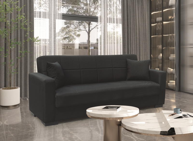 Rover τριθέσιος καναπές/κρεβάτι σε black χρώμα με διακοσμητικά μαξιλάρια που προσθέτουν στυλ και άνεση. Ένας καναπές που συνδυάζει εργονομία, ομορφιά και προσδίδει ζεστασιά στη διακόσμηση του χώρου.Μπορεί να συνδυαστεί αρμονικά με τον διθέσιο καναπέ της ίδιας σειράς για ένα ολοκληρωμένο σετ. Ο εύκολος στη χρήση μηχανισμός επιτρέπει την μετατροπή του καναπέ σε κρεβάτι ανά πάσα στιγμή. Ο αποθηκευτικός χώρος που υπάρχει εσωτερικά του καναπέ εξυπηρετεί στην τοποθέτηση αντικειμένων, βοηθώντας μας να κρατήσουμε το χώρο σε τάξη.