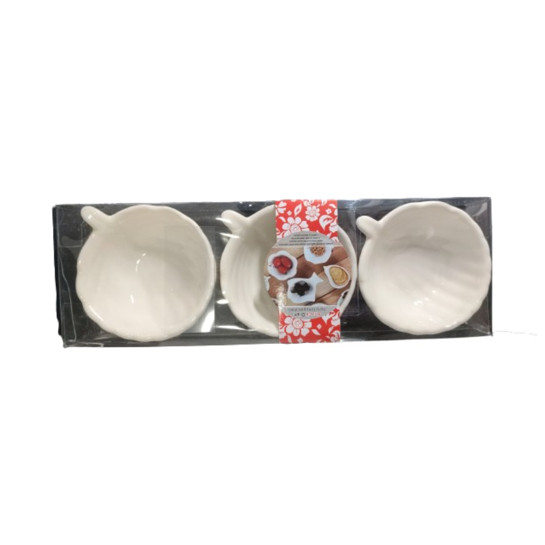 Σετ 3 τεμαχίων μπολάκια. Ιδανικά για ορεκτικά, γλύκα ή ξηρούς καρπούς. Κατασκευασμένα από πορσελάνη. Εύκολο πλύσιμο. Διαστάσεις 9x9x4cm.